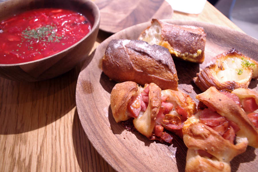 せめてもの息抜きにと、今朝は近くに寄ったついでにトラスパレンテにて朝食を。真っ赤な色が目を惹くスープは、ビーツを使ったミネストローネ。他にもレンズ豆やお野菜がもりもり。出来立てパンを3種、2人で仲良く取り分けていただきました。