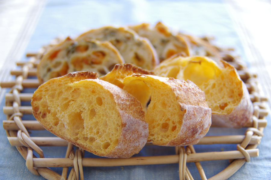 手前のバゲットは断面が綺麗なオレンジ色!雪割人参を使ったバゲットだそうで、フカッとやわらかめの食感。こちらにはクリームチーズを付けていただきました。奥はあんずとシソが練り込まれているライ麦パン。意外な組み合わせでびっくりしましたが、さすが志賀シェフ、見事な味のマリアージュ。これはパテや青カビチーズと合わせたい...と思いつつも待てずに間食。。ごちそうさまでした〜。