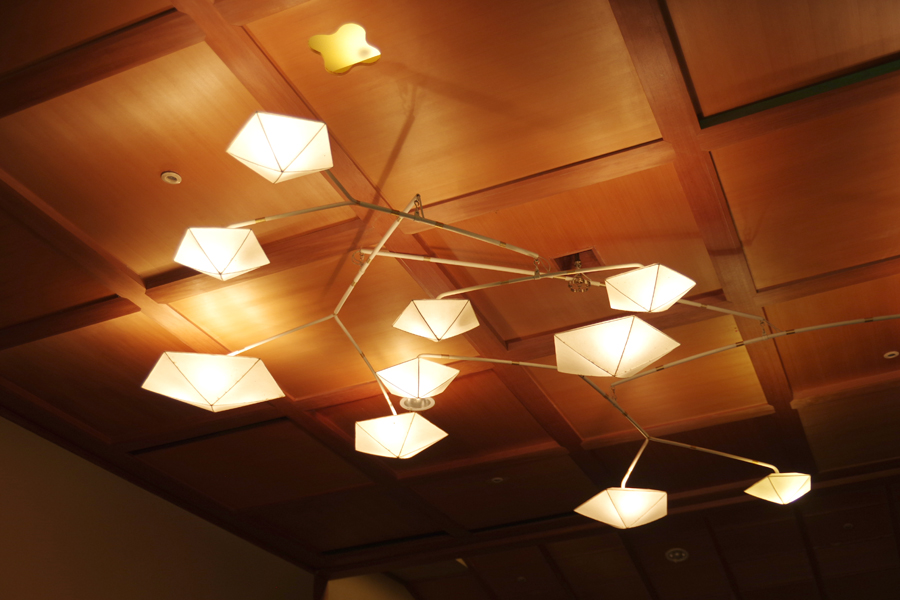見上げると、村野氏デザインのモビール風の照明が目を惹きます。格天井に開けられた花のような穴からも明かりが漏れていて、星空をイメージした天井となっています。
