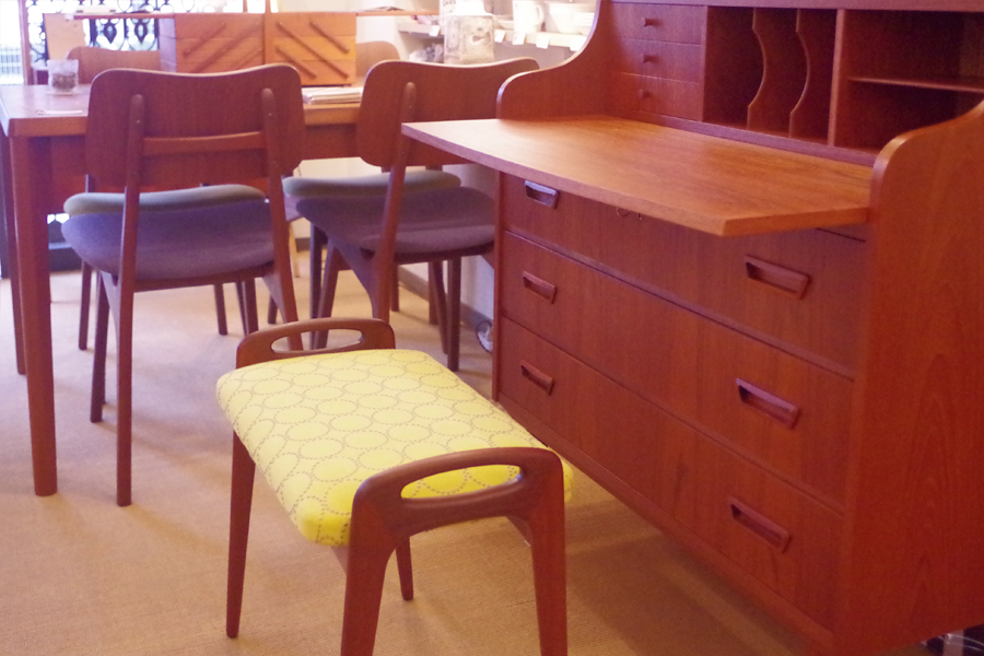 明日出荷のビューローと、張り上がったばかりのスツールを合わせて。スツールは色々なデザインがありますが、これくらい高さのものはビューローにちょうど良いですね。スツールは昨日ウェブに3脚合わせてアップしました。