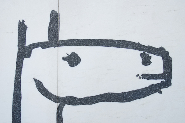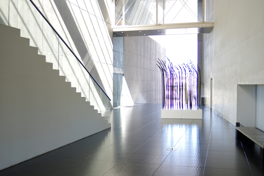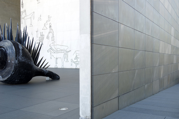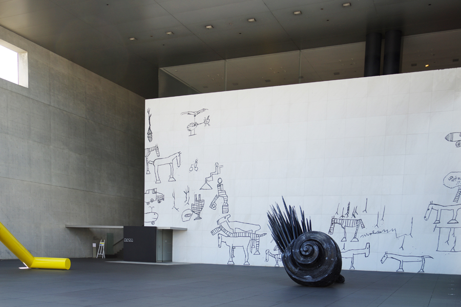 門型フレームのなかには白い大きな壁画「創造の広場」、こちらももちろん猪熊弦一郎作。