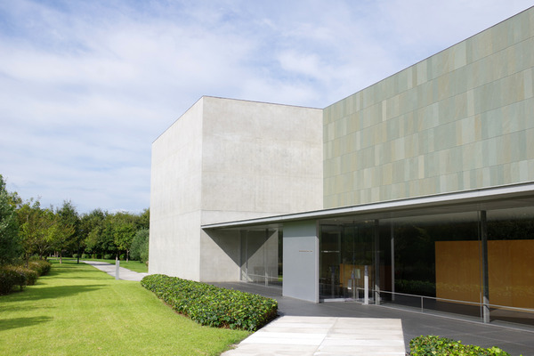 建物は2枚の壁に仕切られて左側にエントランス、右側が展示室となるアシンメトリーな構造。