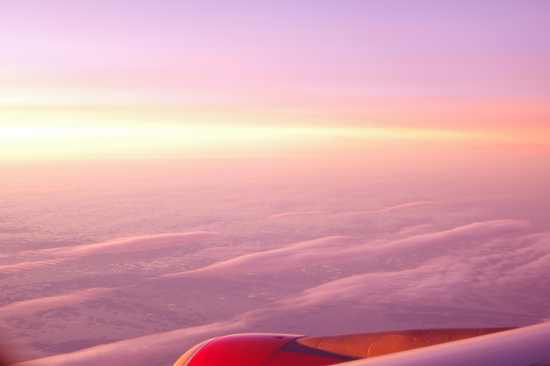 毎度のことながら、年明けよりお正月休みもなく…買い付けにきております。機内では変わらずぐっすり睡眠で、10時間を超えるフライトもほぼ寝ているのですが、途中で少し小窓を開けると、こんな美しいパステルカラーの空を眺めることができました〜。