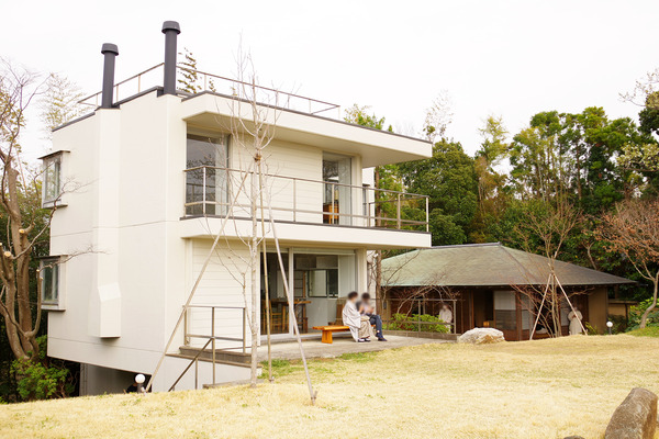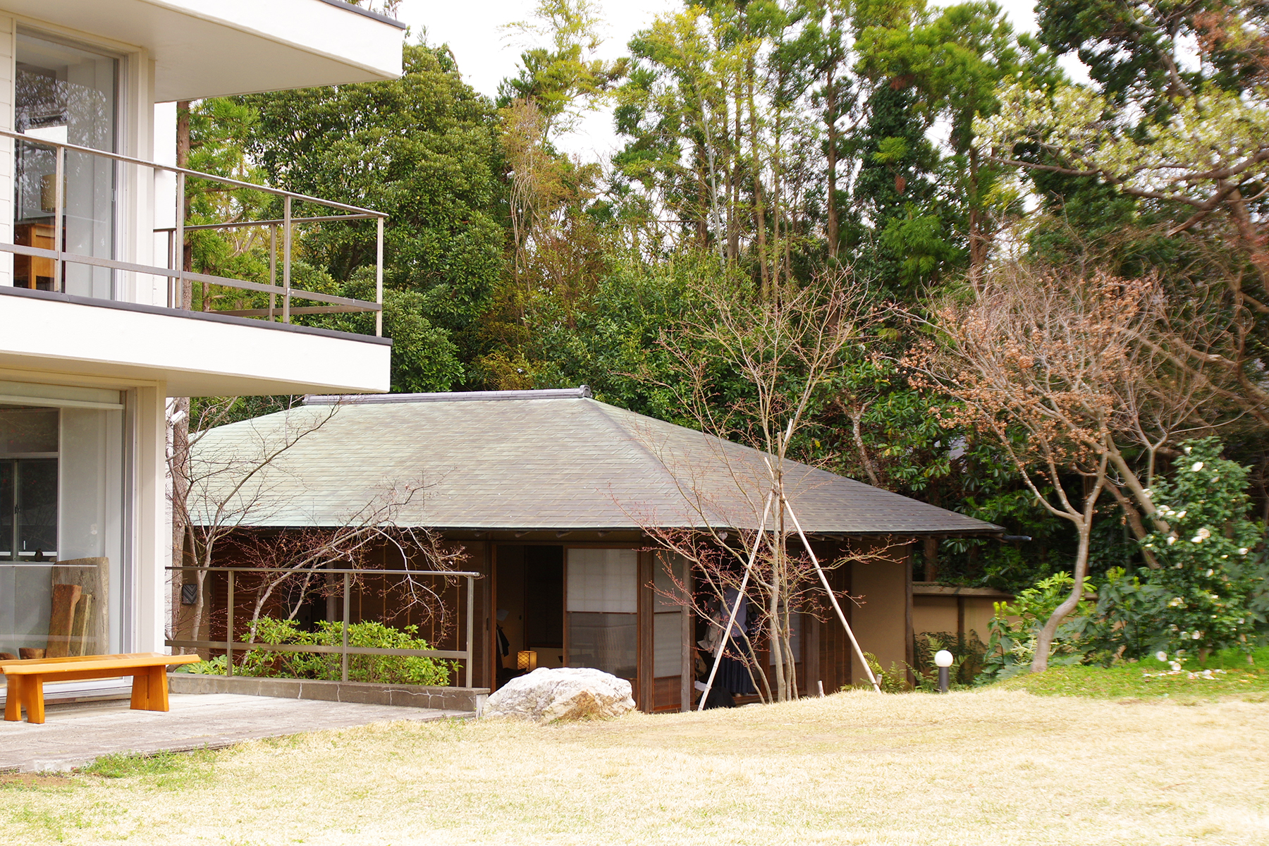 本棟は3階建てで、地中に埋まった1階が最初に訪れた受付部分、芝生と地続きになってみてるのは2階部分。ちょうど立っている下あたりに先ほどのギャラリーがあります。その先に見える平屋建ての茶室がもうひとつの展示空間、本棟から3年後の1977年に完成しました。