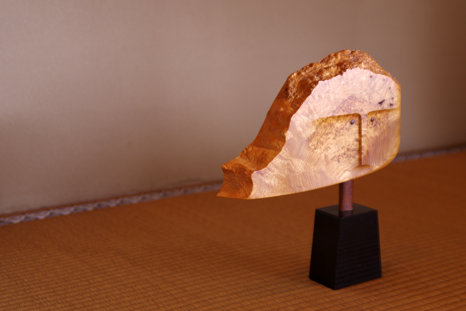 床の間に置かれたオブジェ「木の顔」は桜製作所の前会長である永見眞一氏のもの。見ていると顔がほころんでくるような、温かみがありますね。