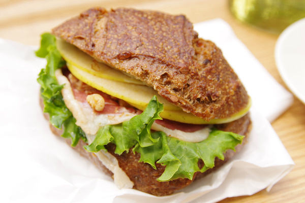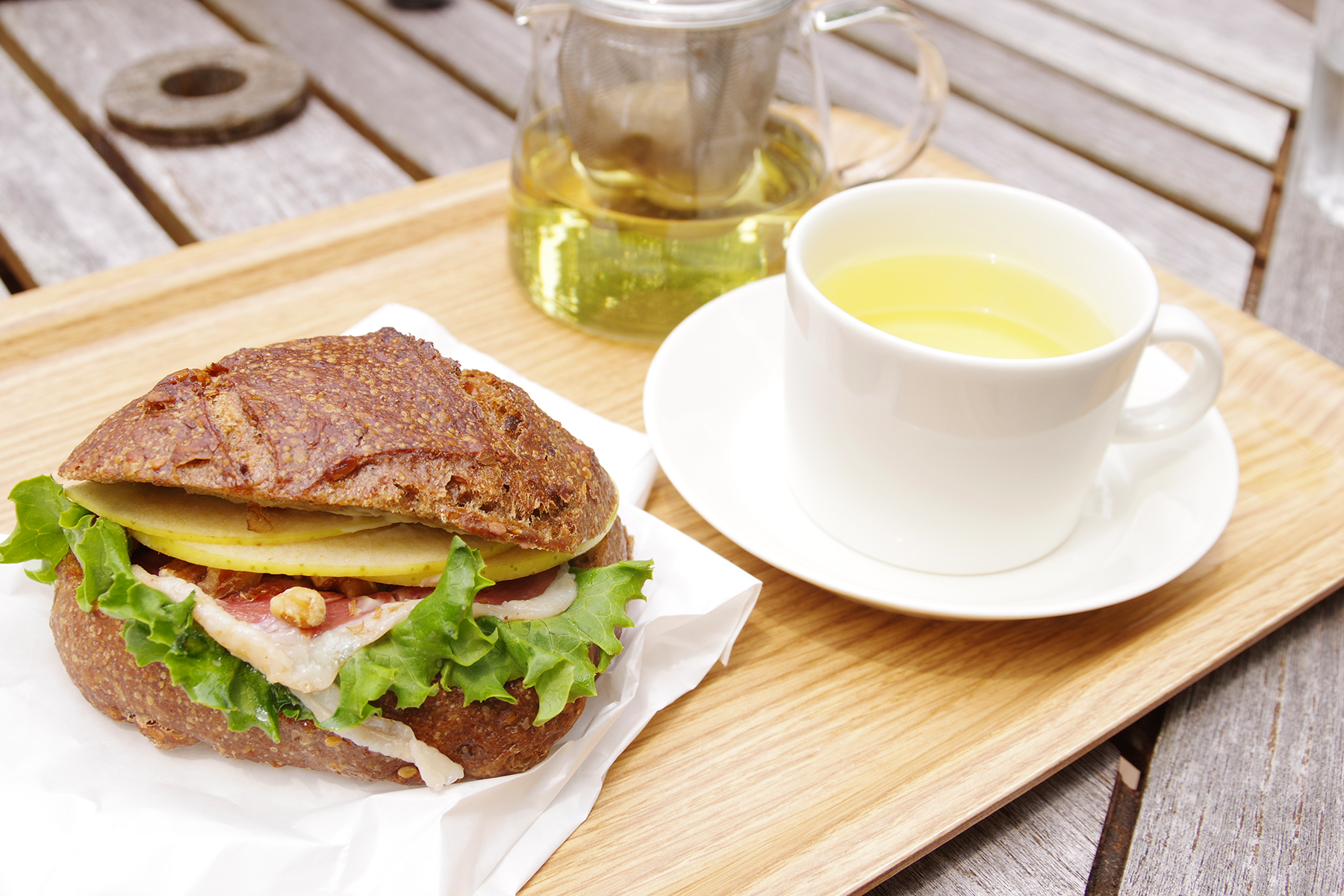 「鴨生ハムと青りんご」使用したパンはクルミ入りでコクとほんのり甘さを感じるもの。そこにとろけるマグレ・ド・カナールの生ハム、シャキッと食感のリンゴが挟まり、一皿の食事なみの満足感。サンドウィッチも多種あるけれど、この美味しさを思い出して同じものをチョイスしてしまうのです。