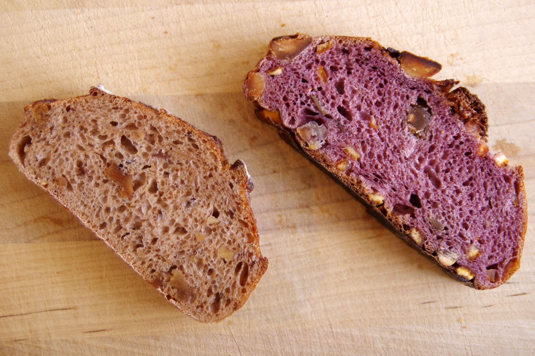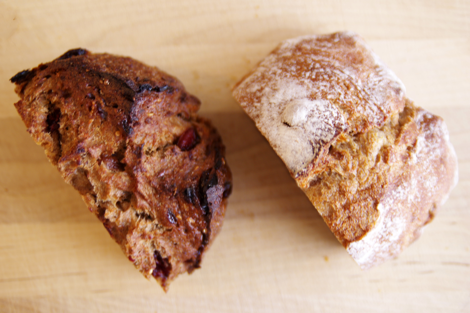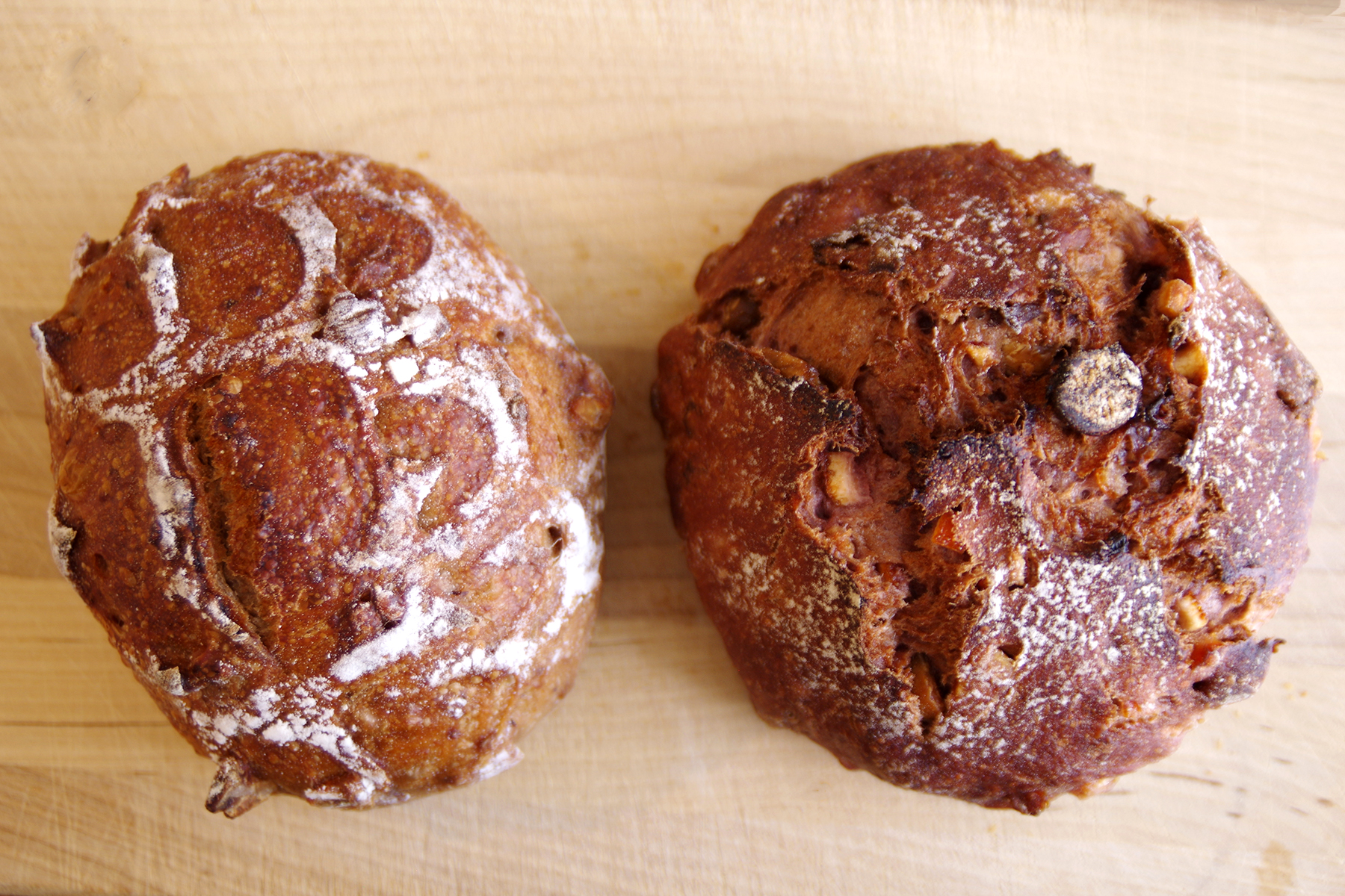 ノア〜はサルタナレーズンの軽やかさを生かしたもの。一方のカシス〜は、が練り込まれた生地に栗の渋皮煮とローストしたマガダミアを合わせた複雑な味わい。