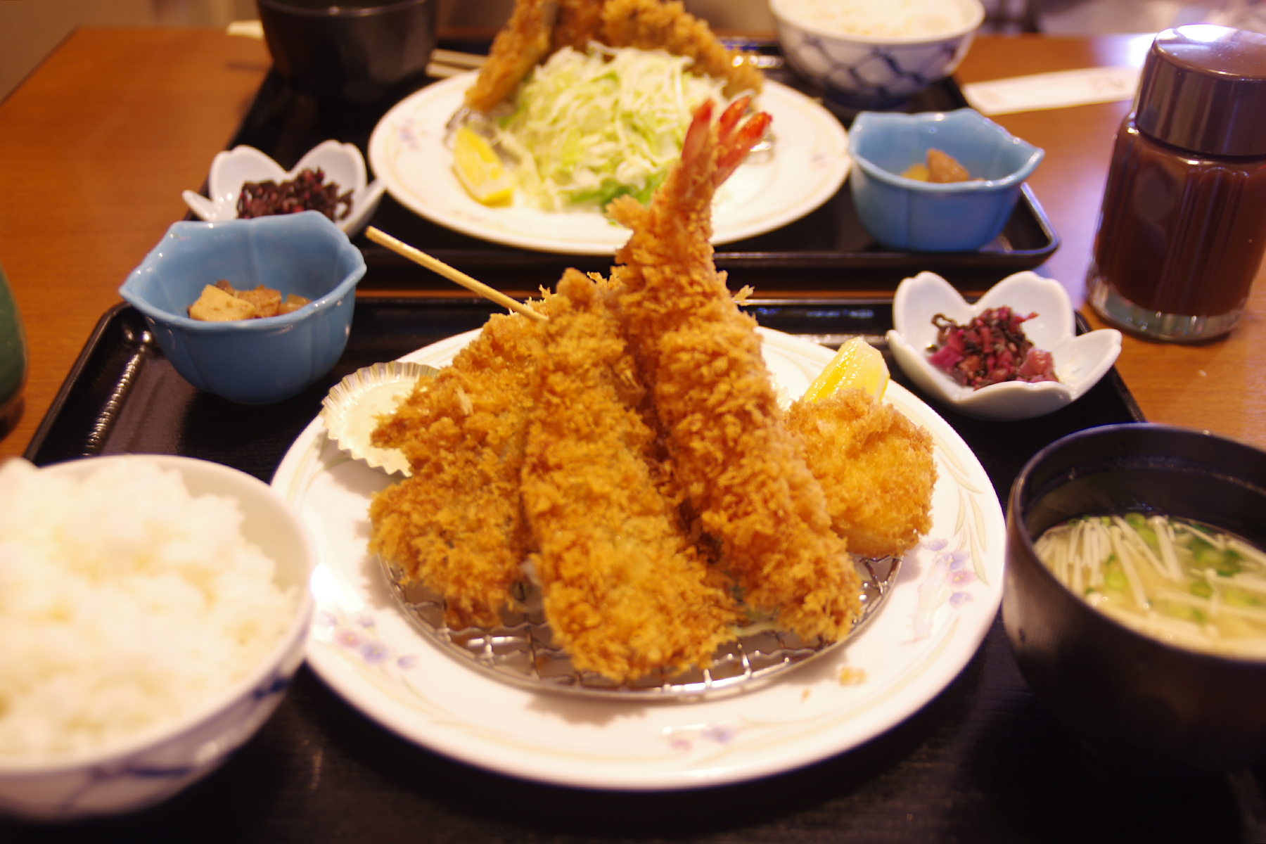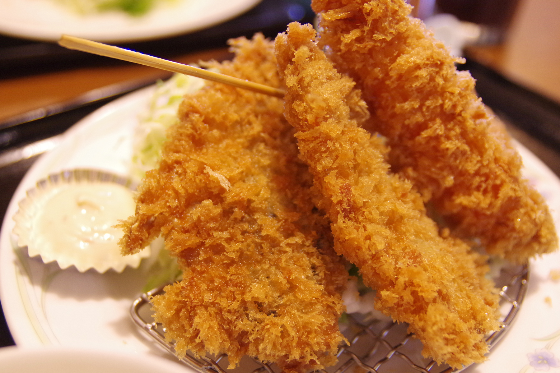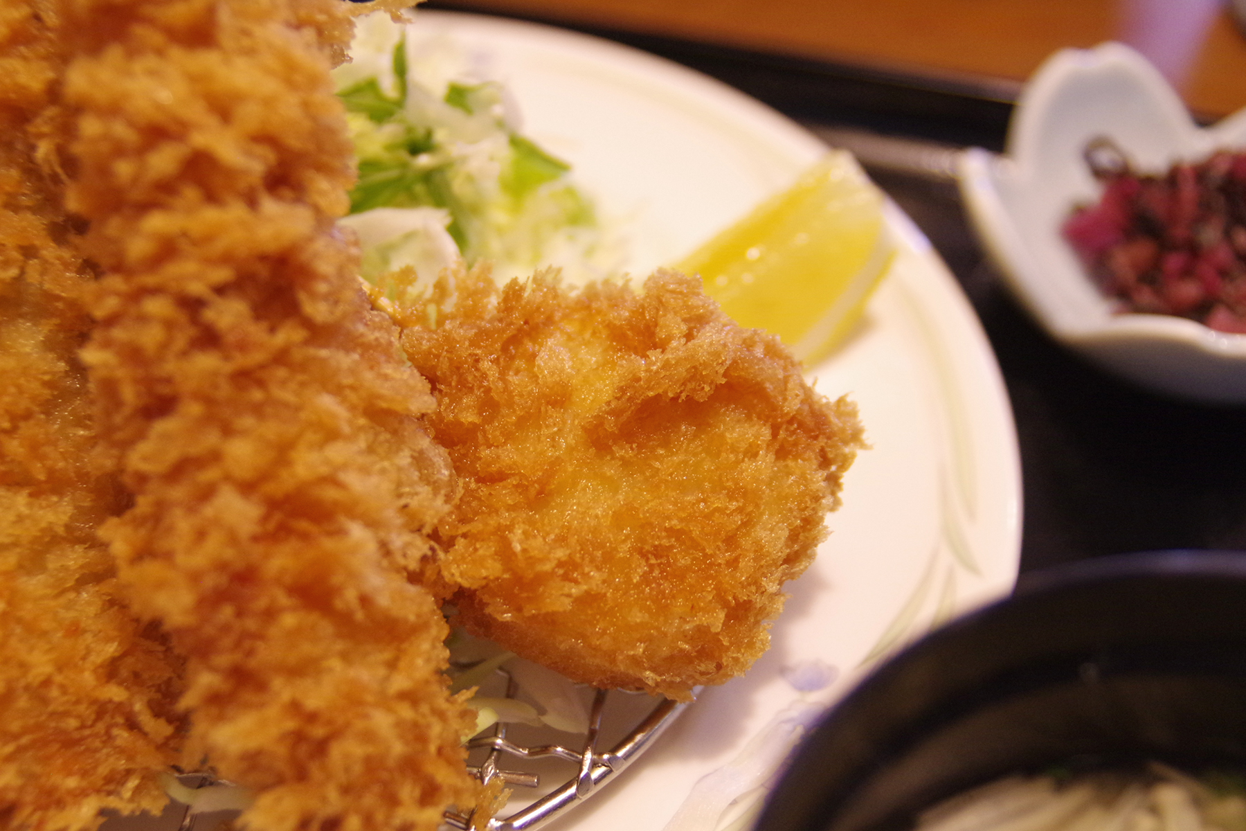 そして海老フライと生帆立フライは添えられたタルタルで味変させながらいただきます。とくに帆立は中心に火ギリギリ通った絶妙な火入れ加減で、こちらもアジフライ同様にバツグンの味わいです。