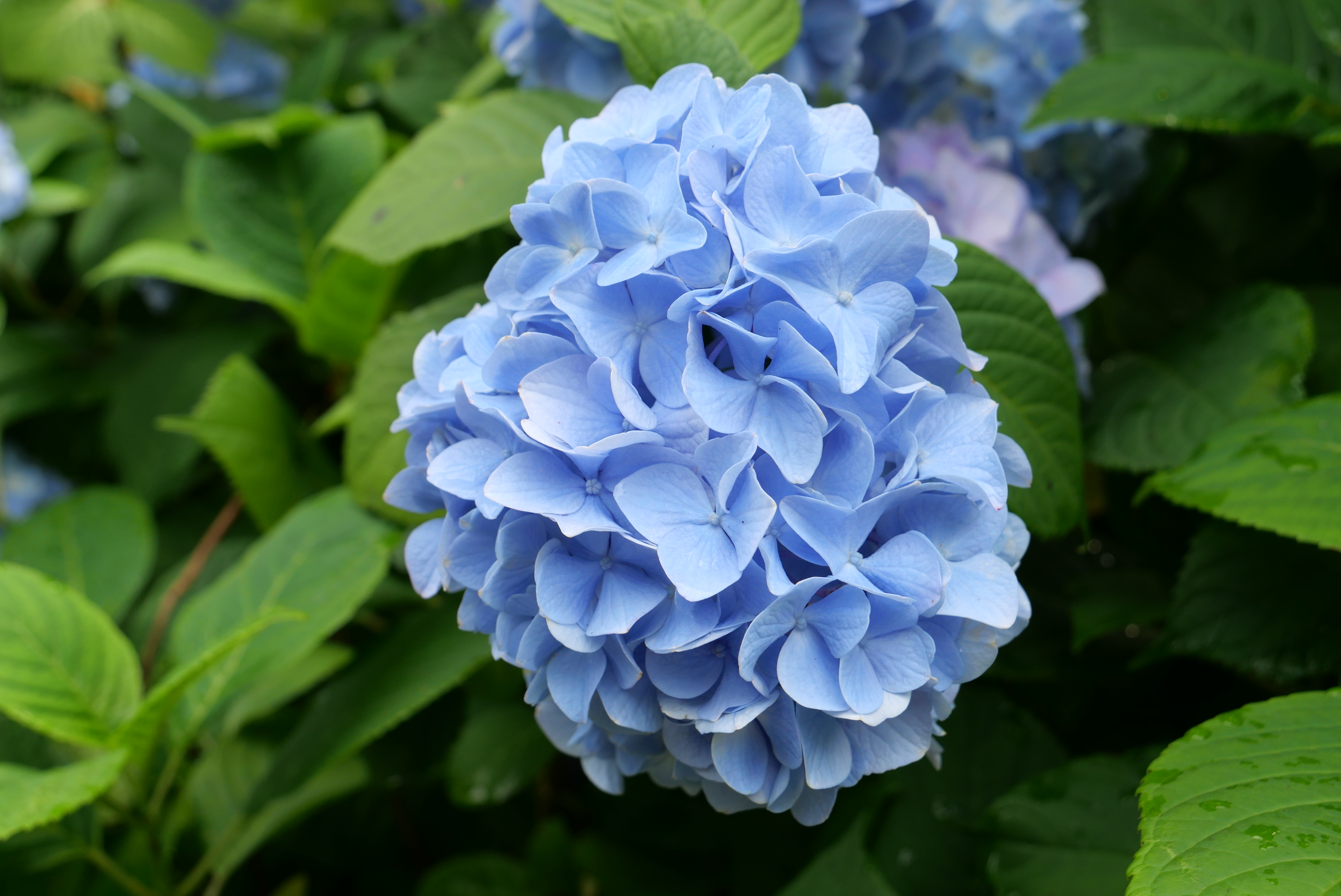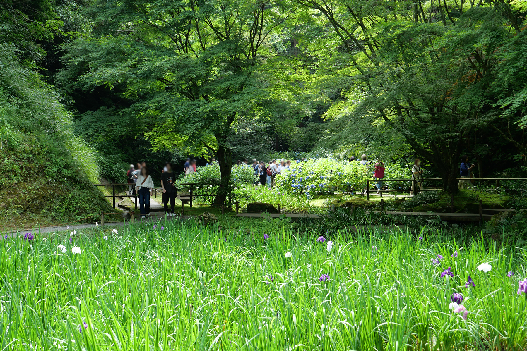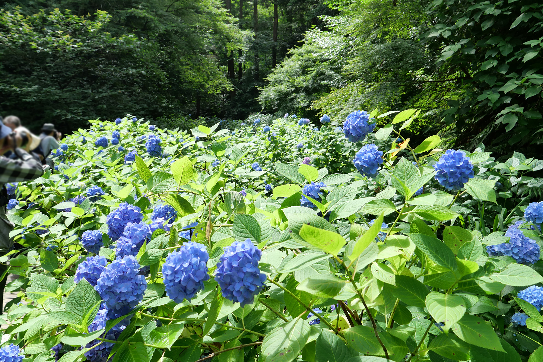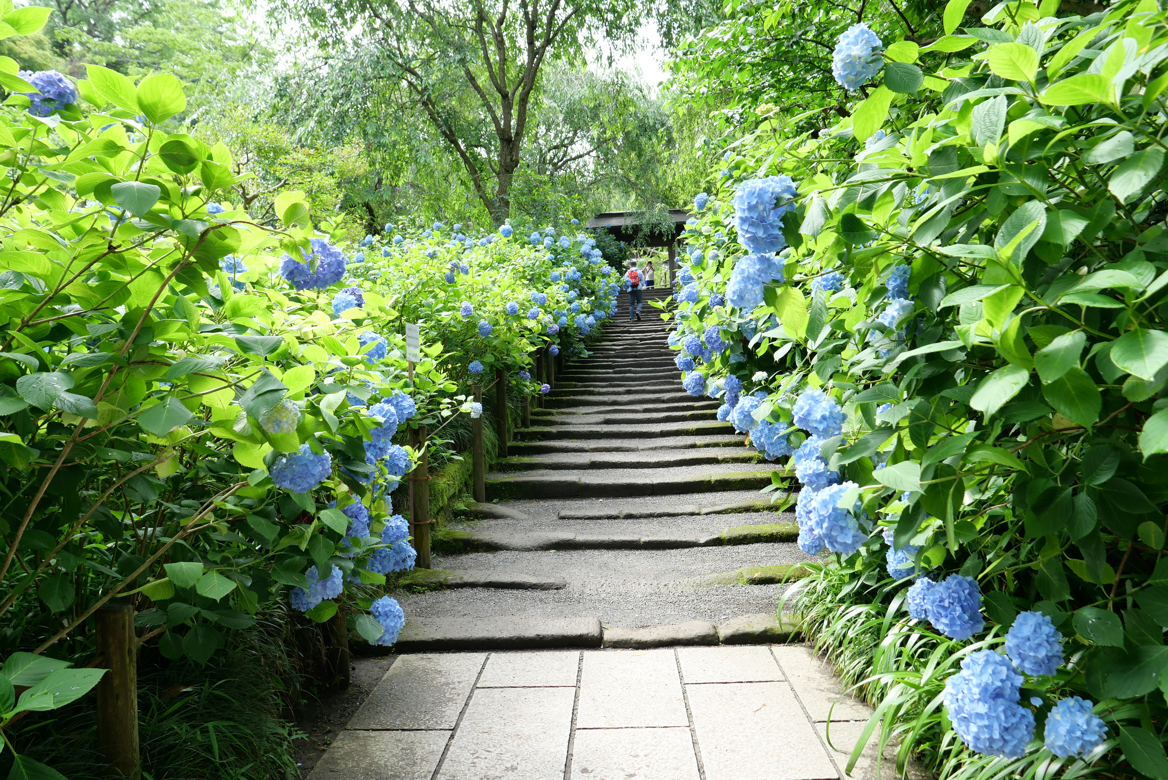 2,500株の紫陽花で埋め尽くされた広い境内は、明け方やんだ雨でしっとりと風情ある雰囲気が漂っています。