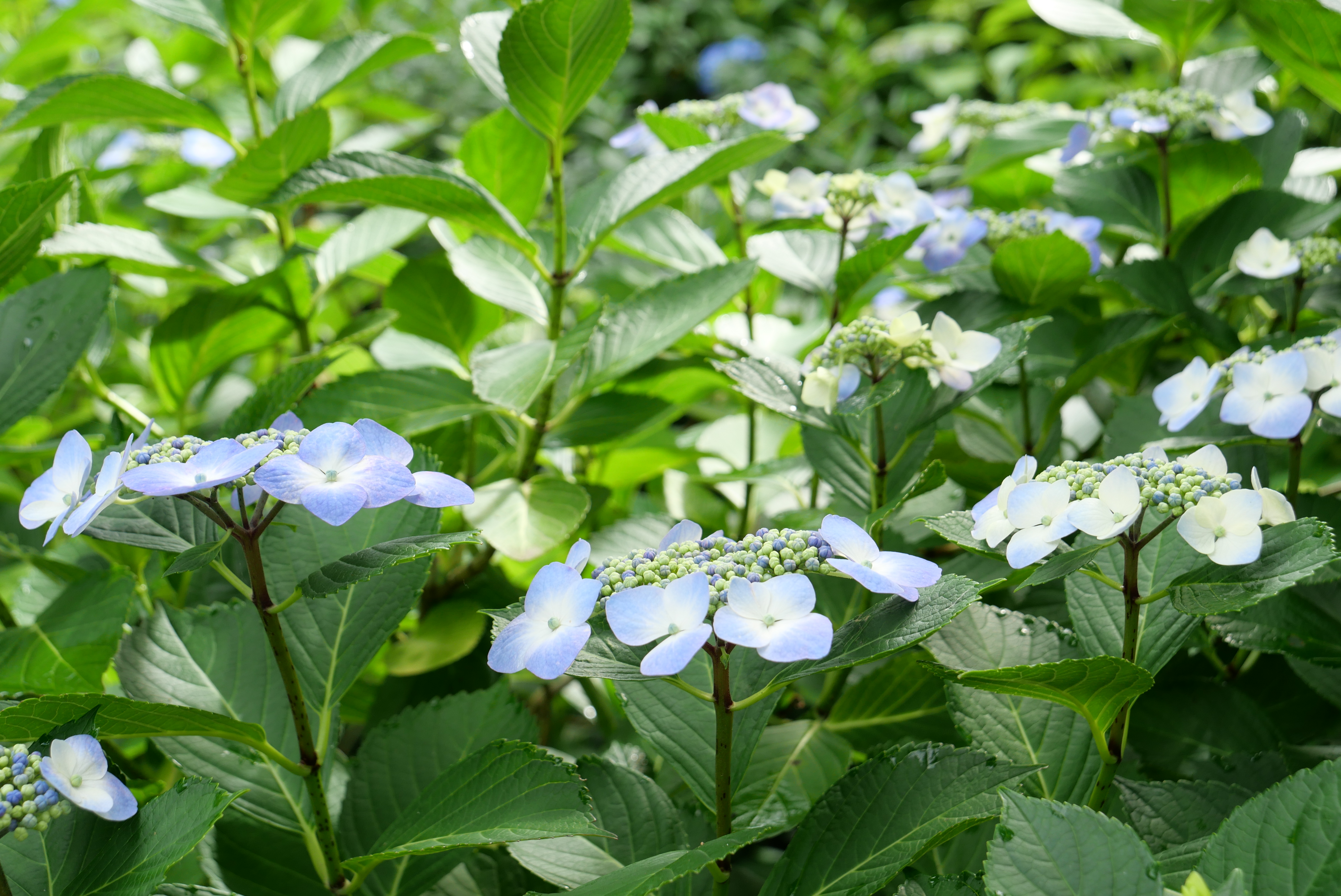 こちらはヤマアジサイかしら?陽の光を浴びてキラキラ輝いています。