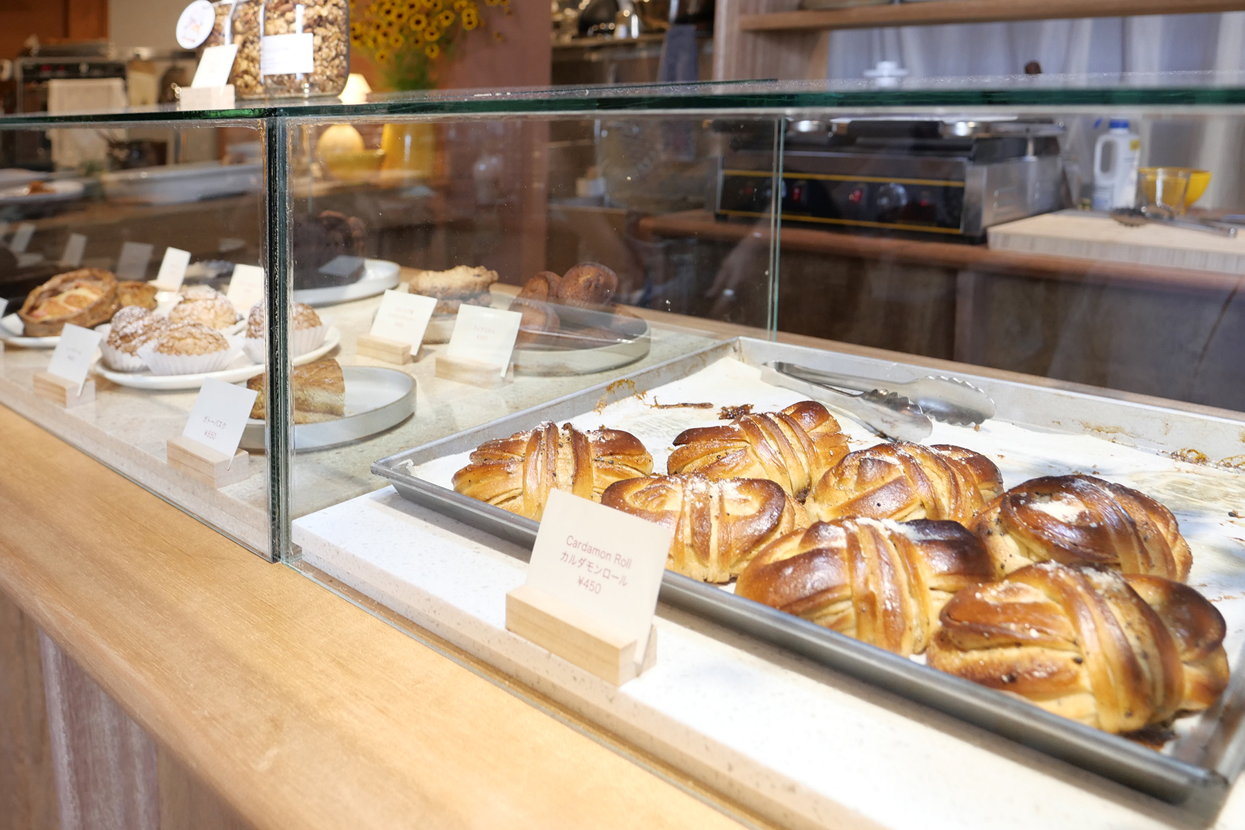 木〜日曜日にカフェ営業をされていて、雰囲気ある店内には大きな焙煎機も鎮座。ショーケースを覗くとカルダモンロールの巻き方やプレートの使い方など、馴染みのあるコペンハーゲンのコーヒーショップを感じる心地よい店内です。