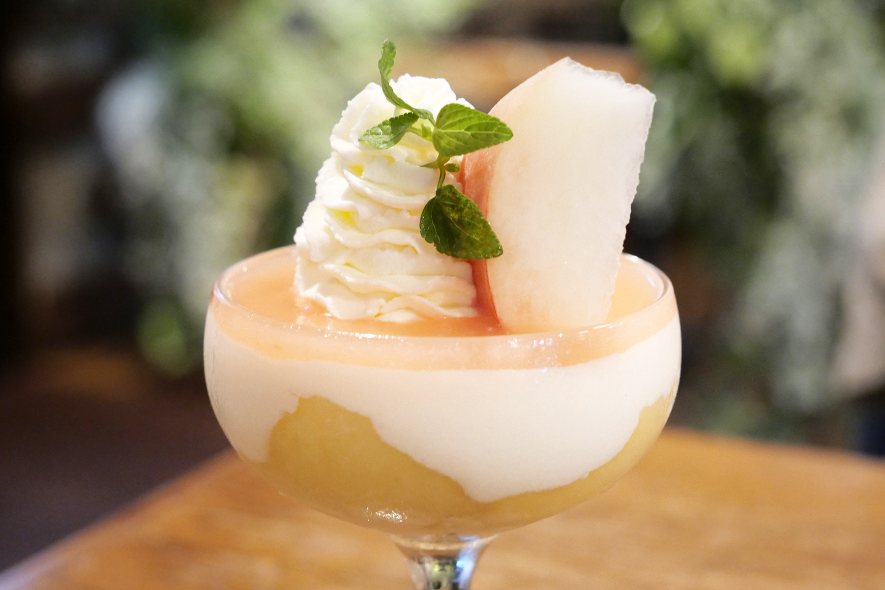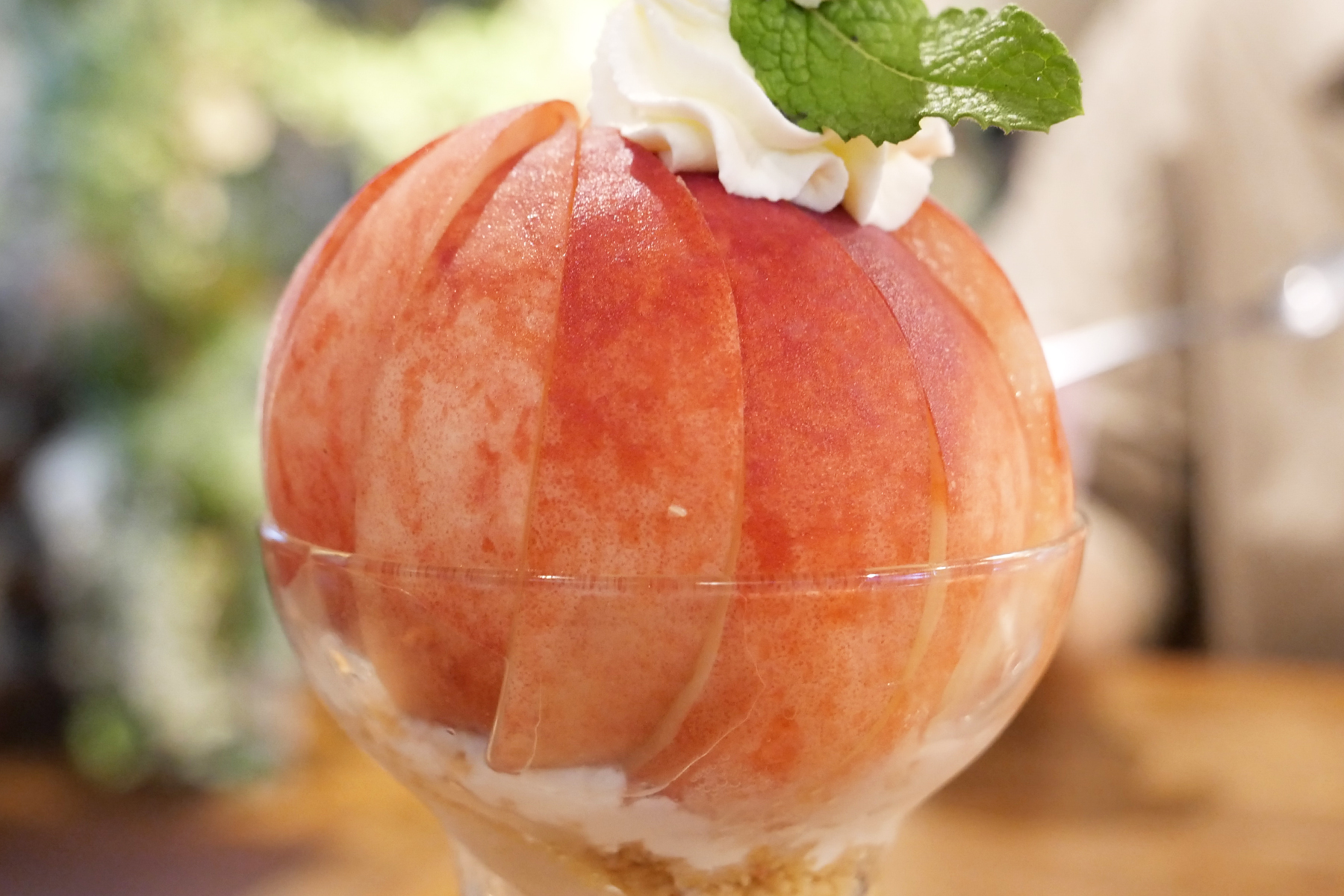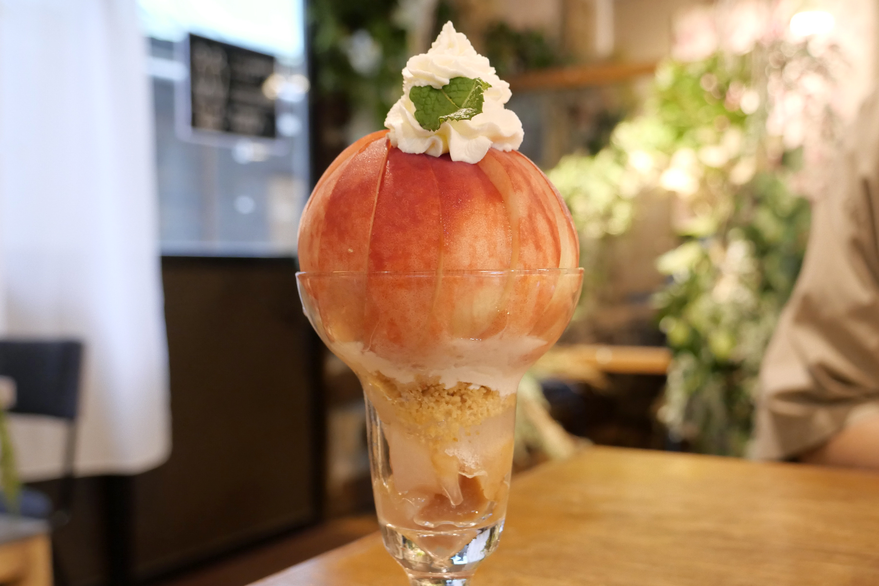 事前会計の後は席に座り待っていると、やってきました桃を丸ごと1個使ったパフェ「ピーチジュエル」!