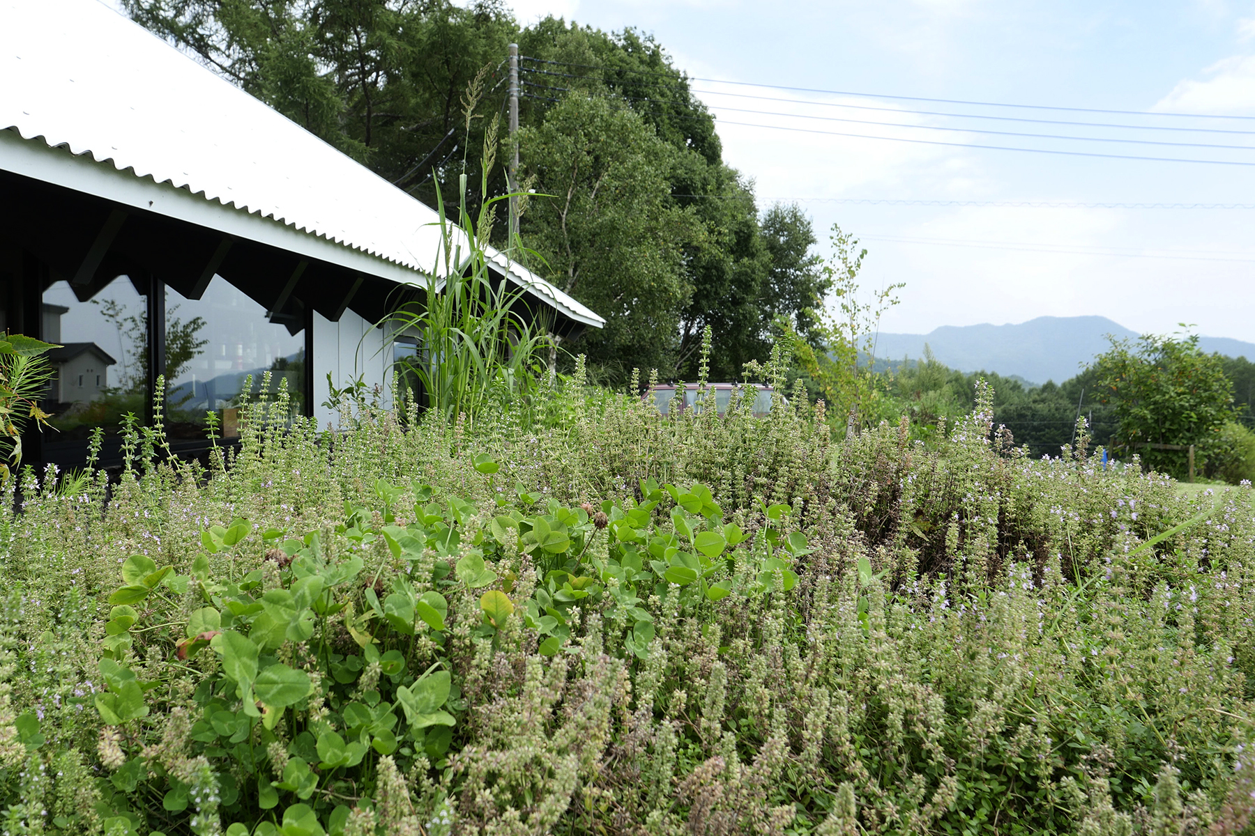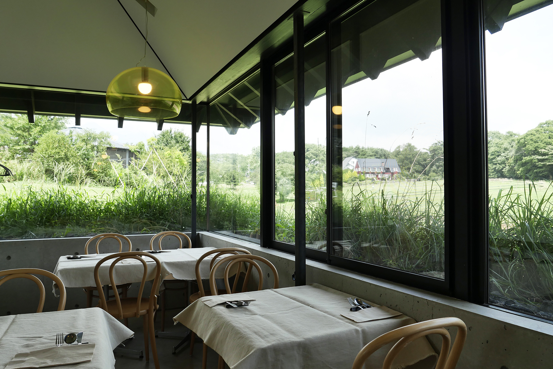 丘の起伏に沿っているからか目線が地面に近く感じ、まるで緑に包み込まれているような安心感があります。一番乗りで席につきましたが、7つあるテーブルはどんどんと埋まっていきました。