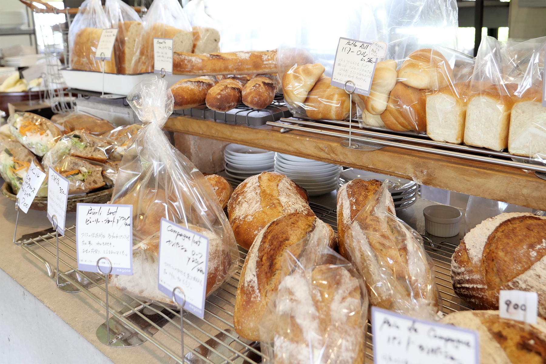 席の後ろはカウンターになっていて、焼きたてのパンがたくさん並んでいます。ここに並んだサンドウィッチにドリンクを一緒にテイクアウトして、外の芝生でピクニックしている方も多く、様々な使い方のできるお店としてみんなに愛されていますね。