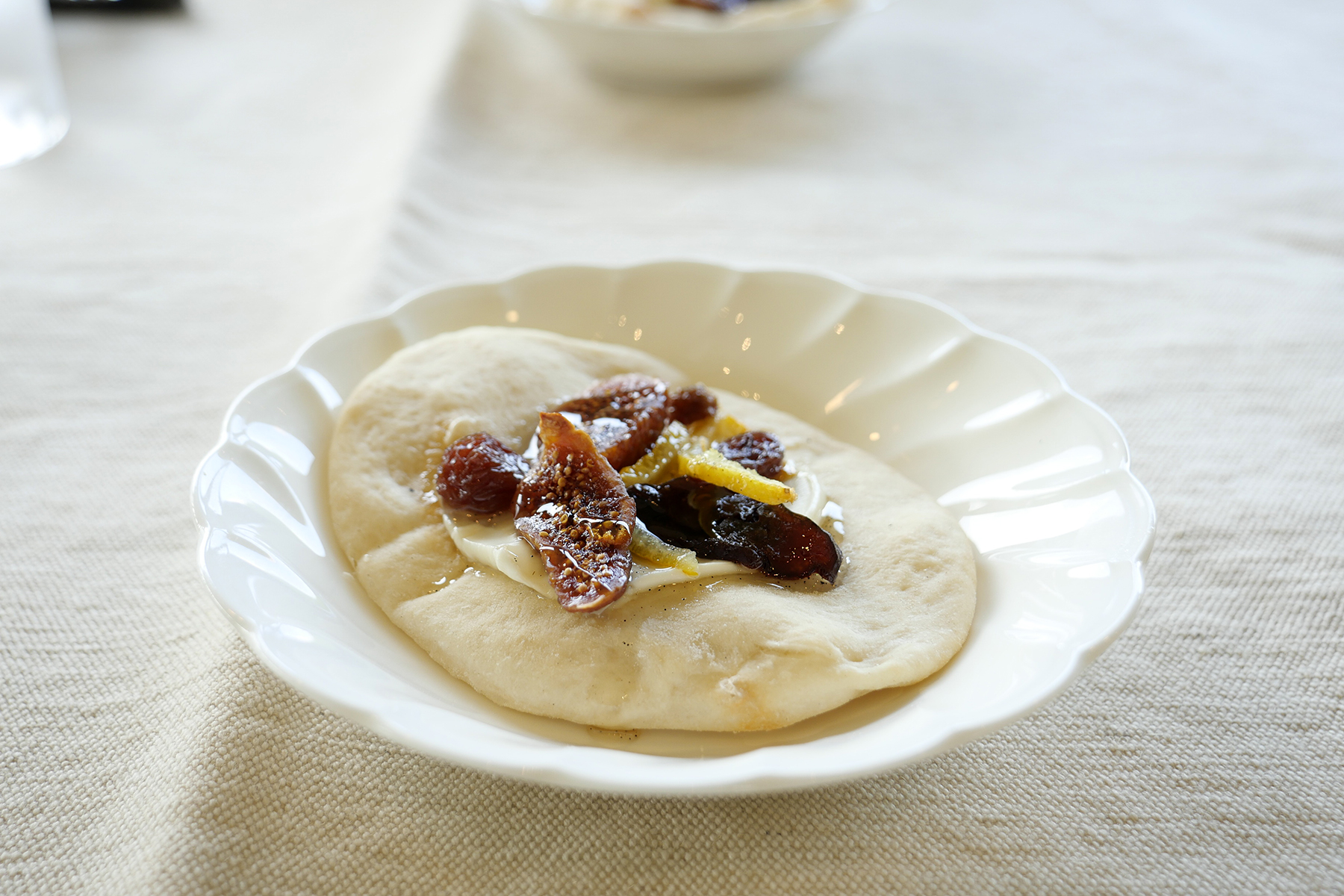 まずはアミューズでやってきたのはドライフルーツが乗った小さなフォカッチャ。薄く塗られたクリームチーズにイチジクなど薄切りのドライフルーツ、その上にトロリと蜂蜜がかかっています。