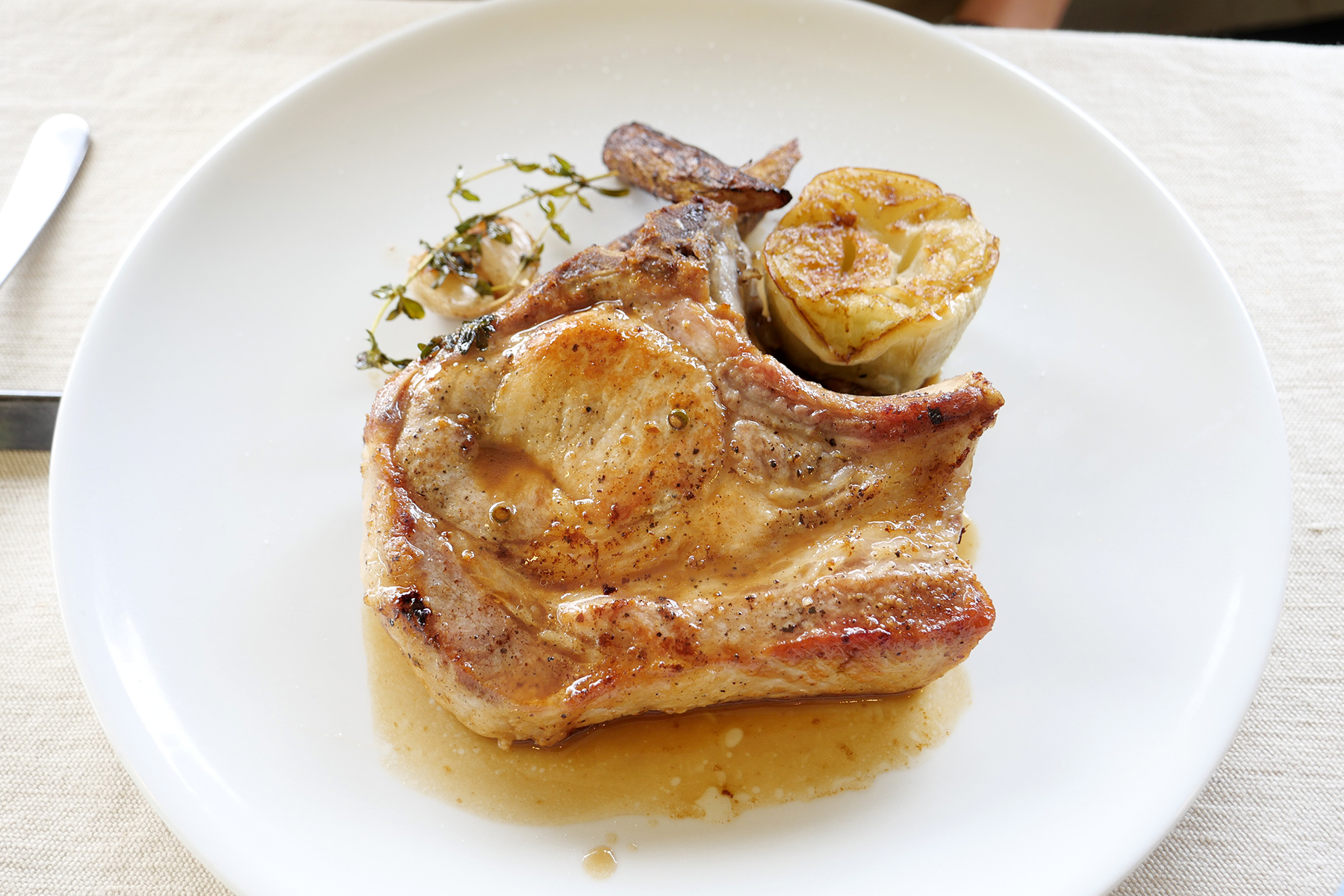 サリュオーナーは「山伏豚 骨付き肉のロースト 緑コショウソース」。こちらも厚切り!
