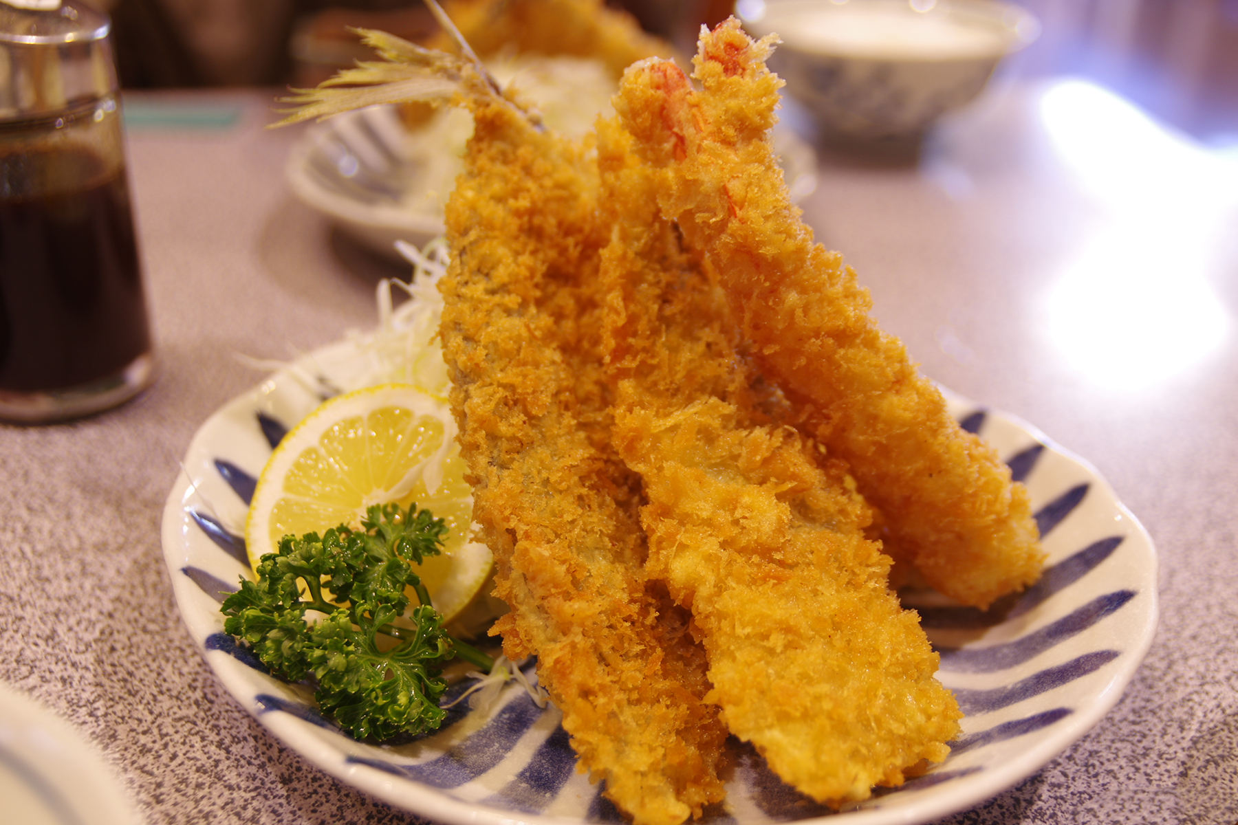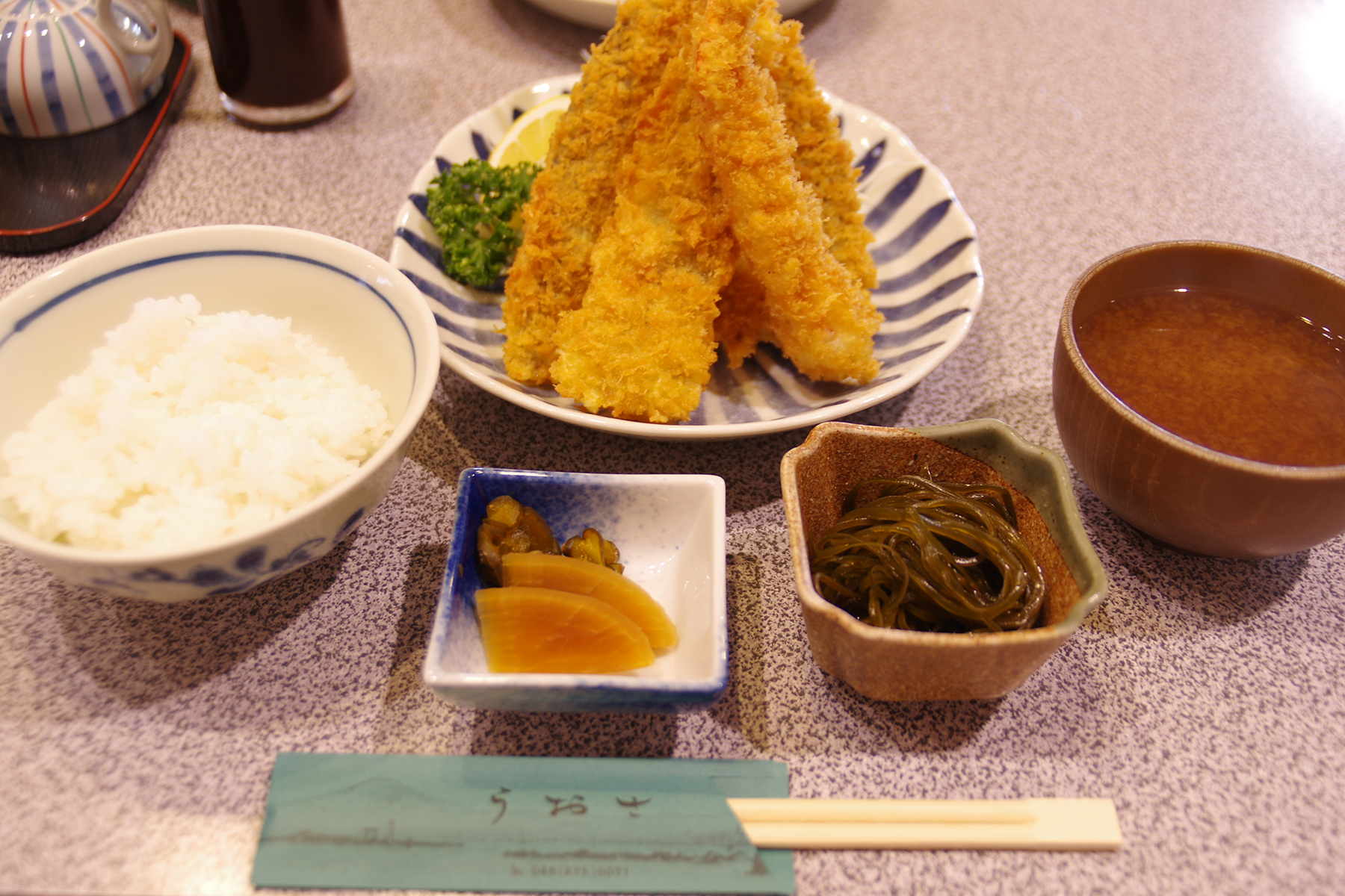 大きなアジの開きとエビフライ、そして日替わりの一品は太刀魚でした。臭みのない新鮮な味をサクサク食感で揚げられていて、ソースではなく塩&レモンでいただきます!定期的に食べに行く小田原・大原のふわっと食感とはまた異なる食感で楽しむことができました。