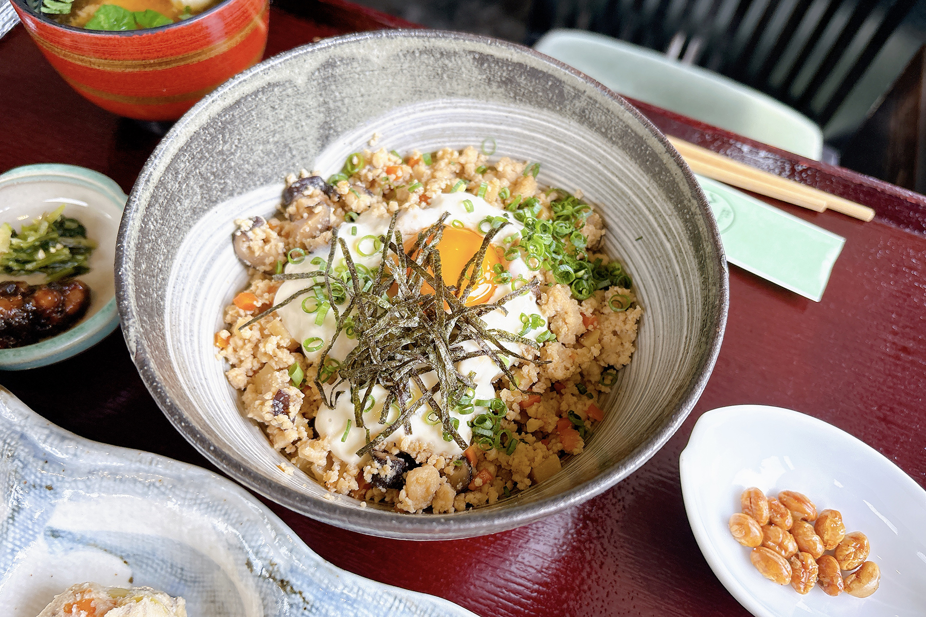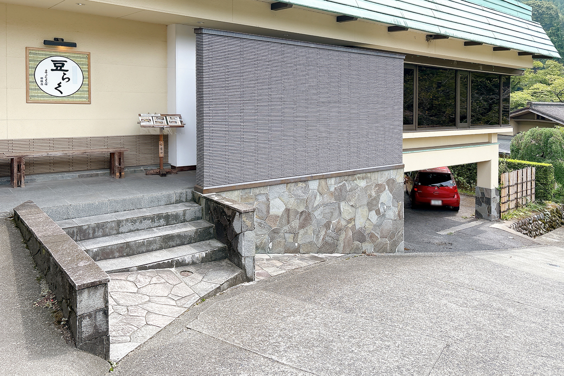 ここは窓の向こうに見える古民家「料亭 ままごと屋」の姉妹店で、日本酒を仕込む名水を使った豆腐料理がいただけます。この「豆らく」でいただいている豆腐も「ままごと屋」で作られてものだそう。