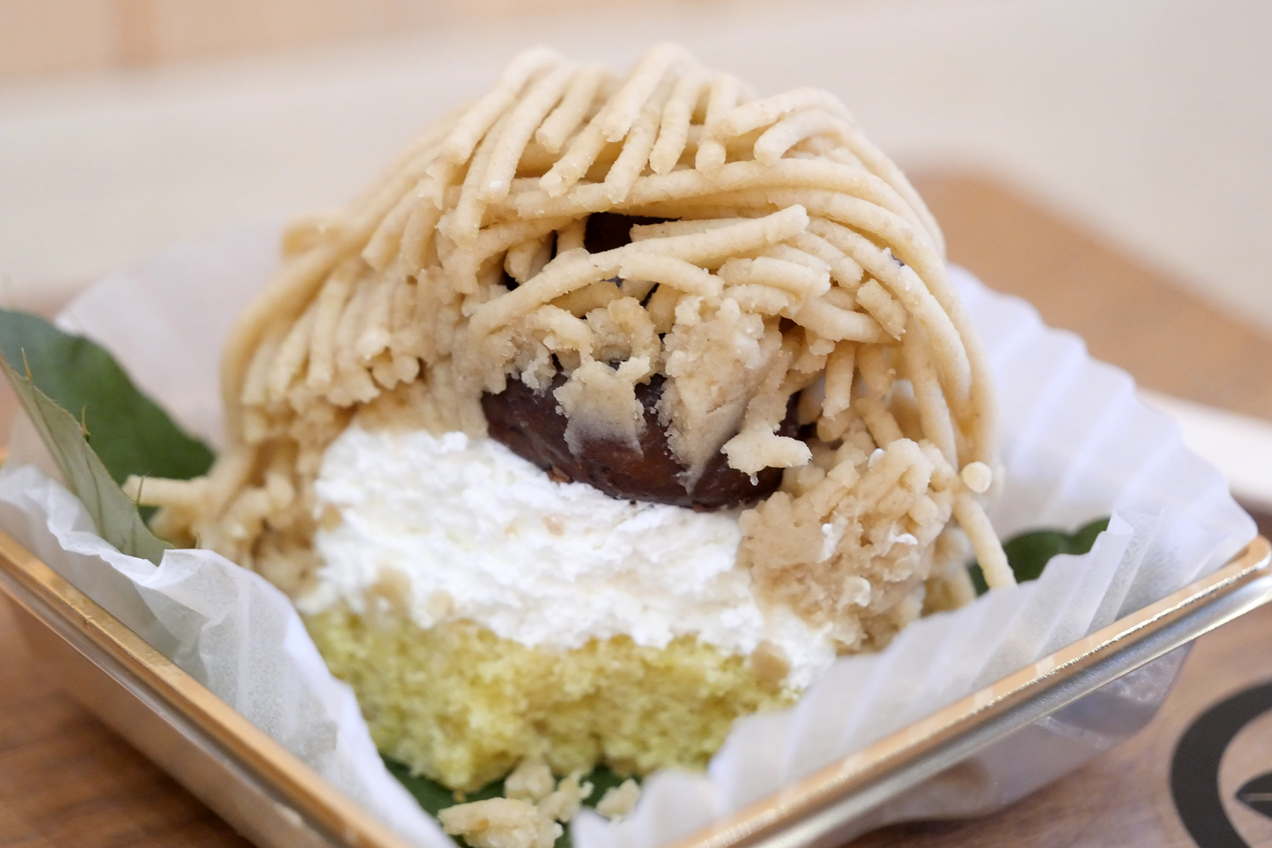 栗きんとんの焼き菓子を土台にクレーム・パティシエール、栗の渋皮煮、そして栗きんとんのペーストがたっぷりと絞られ、これぞ栗づくし。