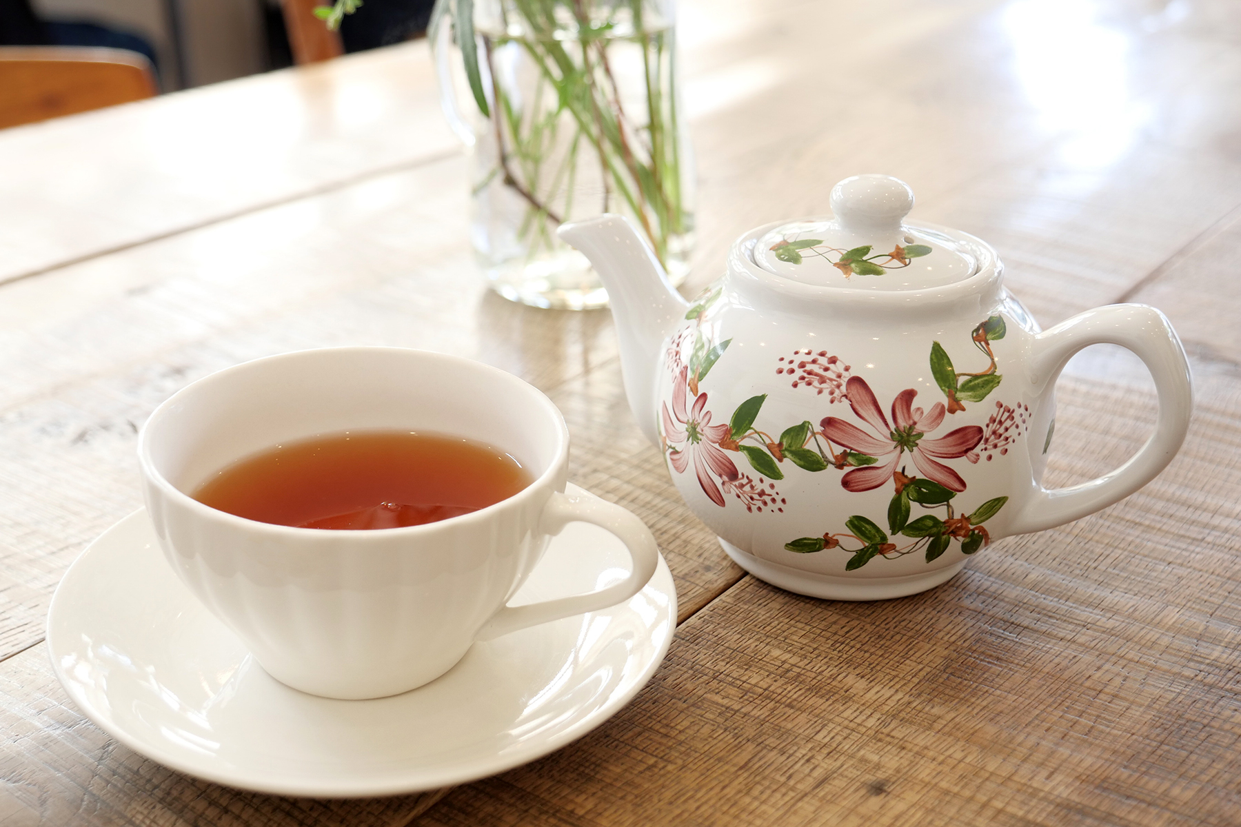 桃に合わせて選んだのはダージリンティー、愛らしいポットにたっぷり入っています。