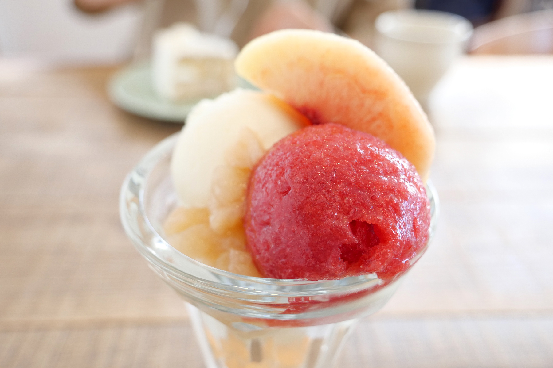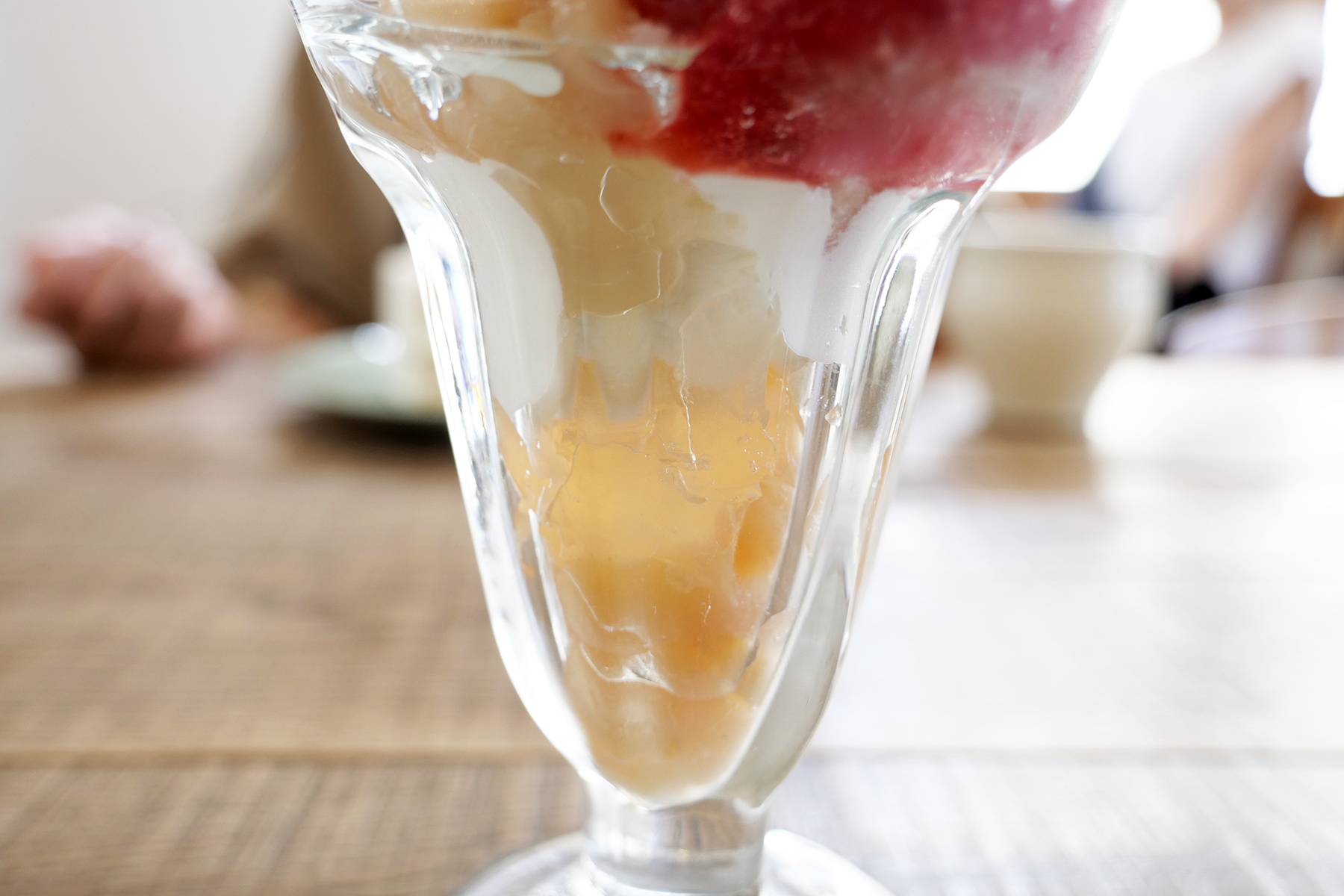 その他にはコンポートやジュレなどが入っていて、スイスイと食べ進めてしまいました。食べていて思ったのはフレークやグラノーラ、ジェノワーズ生地などの固形のものが入っていないこと。パフェグラス1杯が時に重く感じるのがそんな固形のものだったりするので、パフェといえばよく入っているもの…を何となく入れずに、主役を立てる構成になっていることがとても嬉しく感じました。