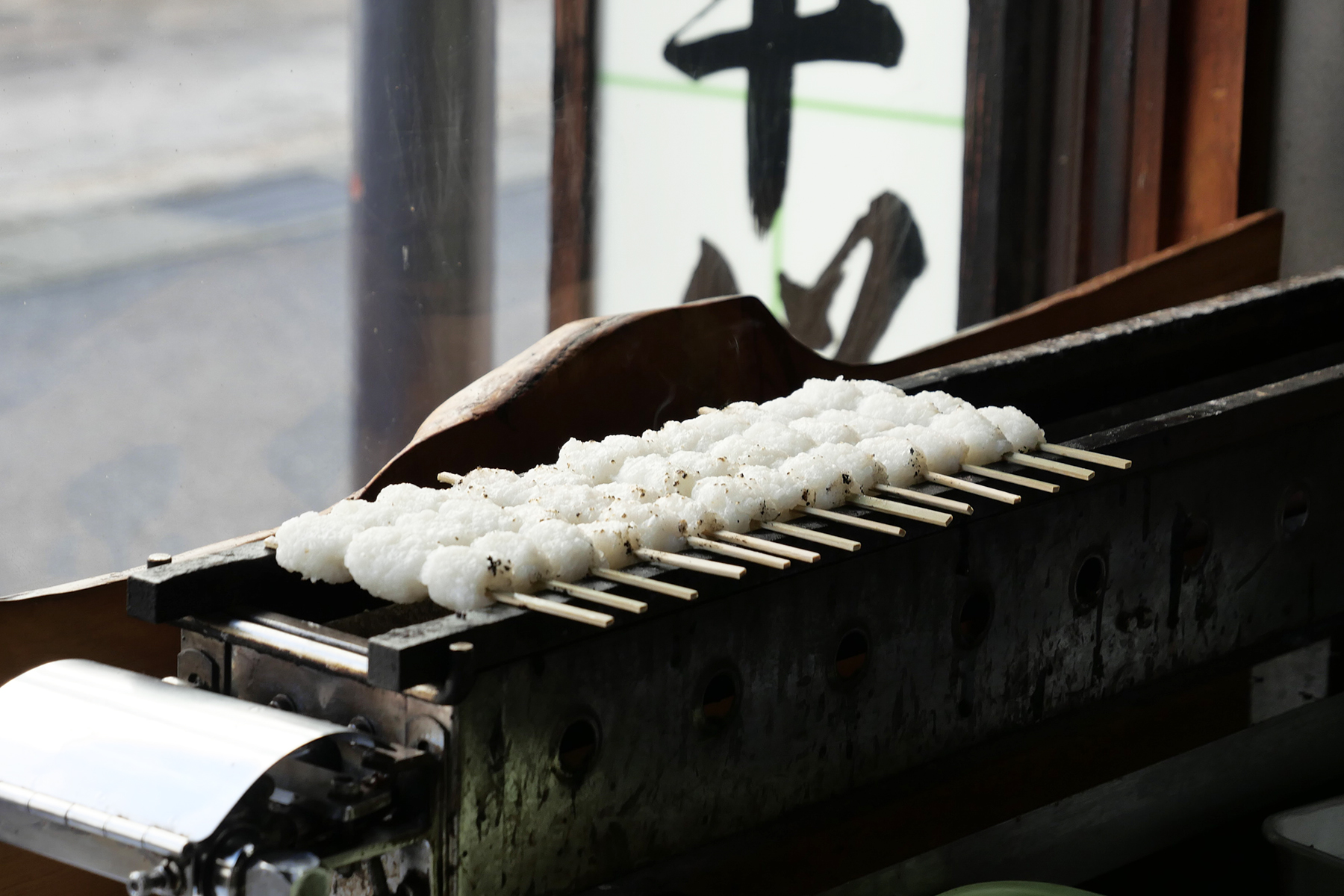 ちょうど店先で焼いている所を見せていただきました。うるち米を潰して串に刺す五平餅、形はわらじ型だけだと思っていたので、団子型があることを初めて知りました。