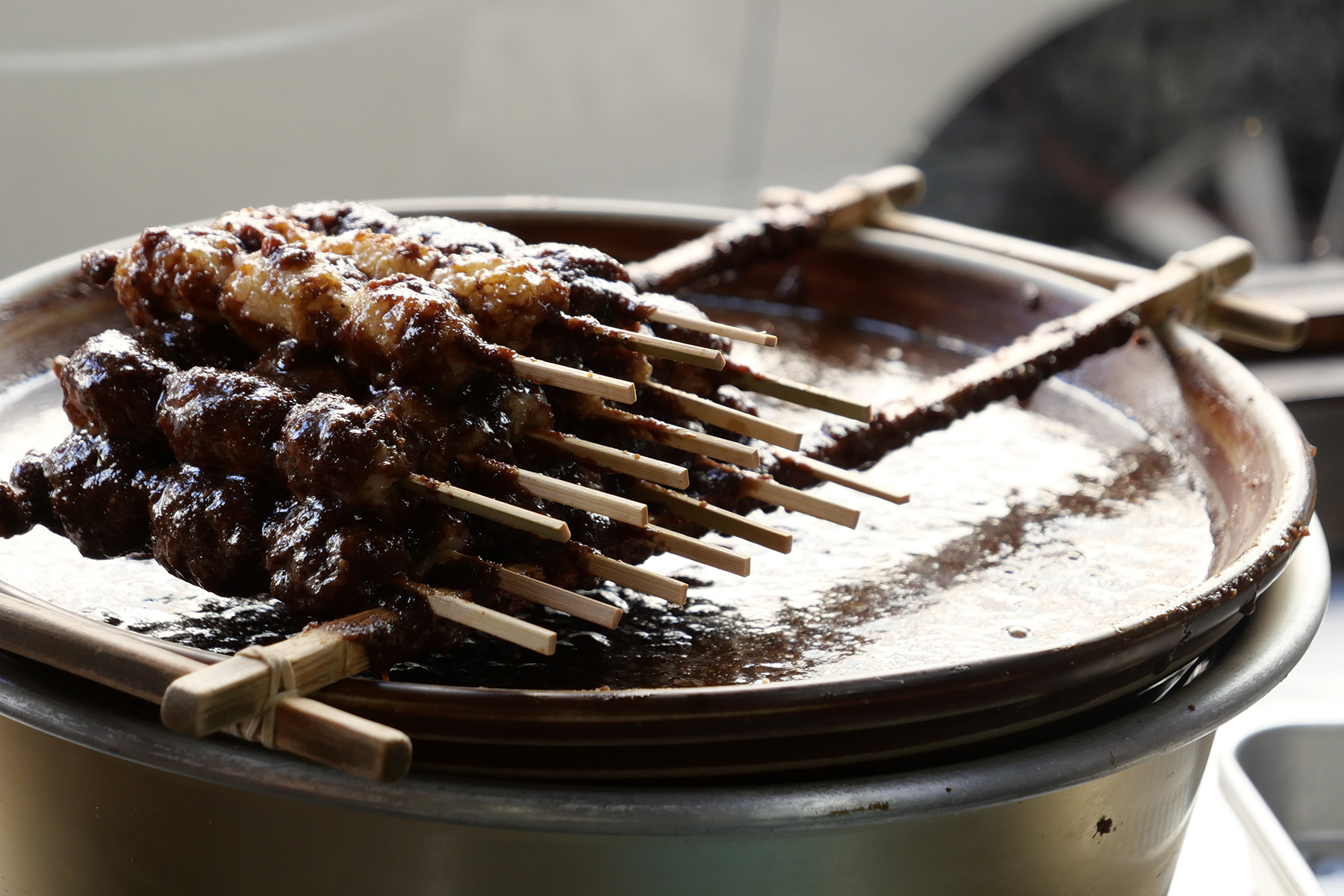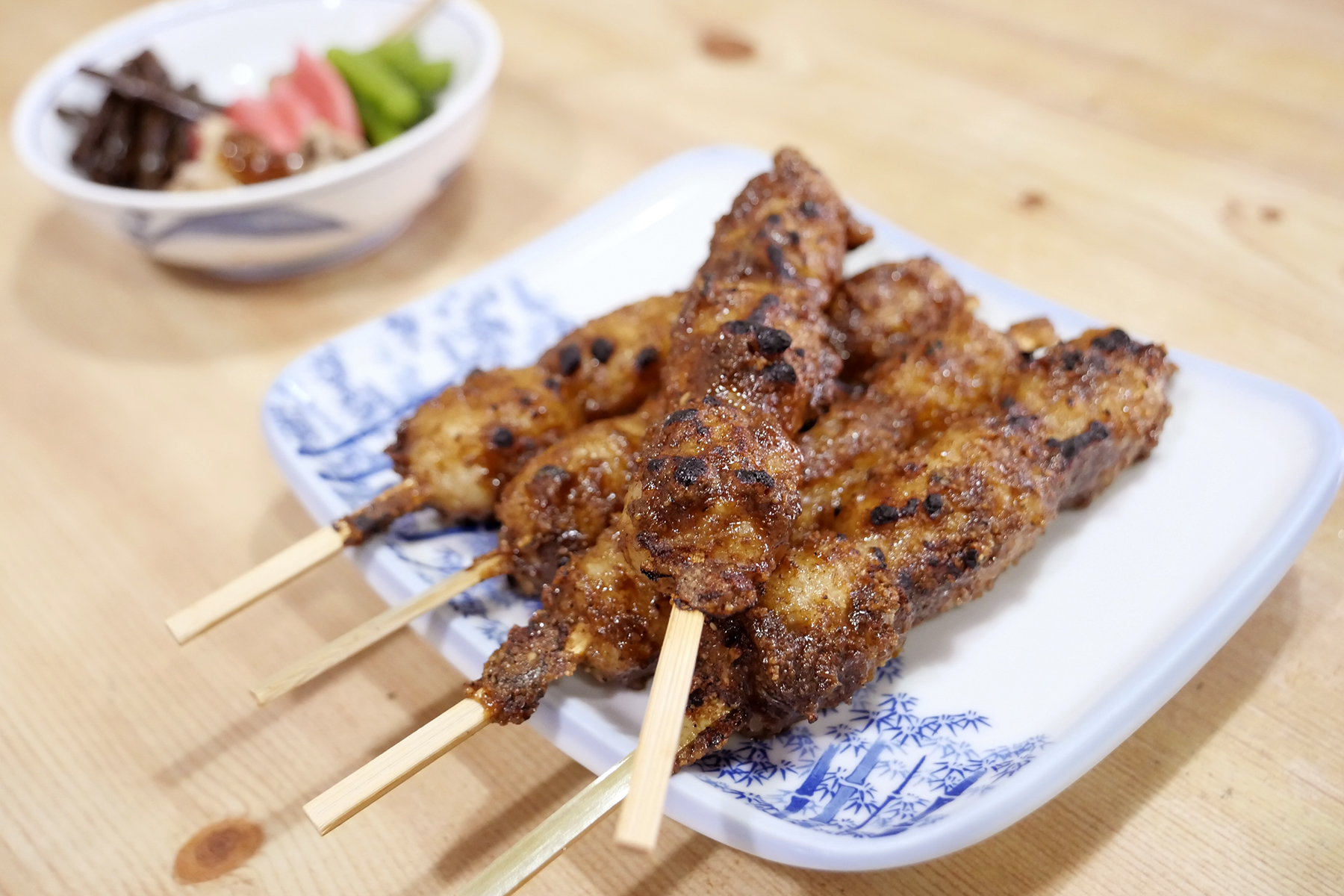 5串にお漬物の付いたセットを3人でシェア。秘伝のタレは胡桃、砂糖、醤油そして胡麻が入っているのだそう。これに汁物などがついた定食もあって、お腹が空いていたらそちらを試したかったほど。