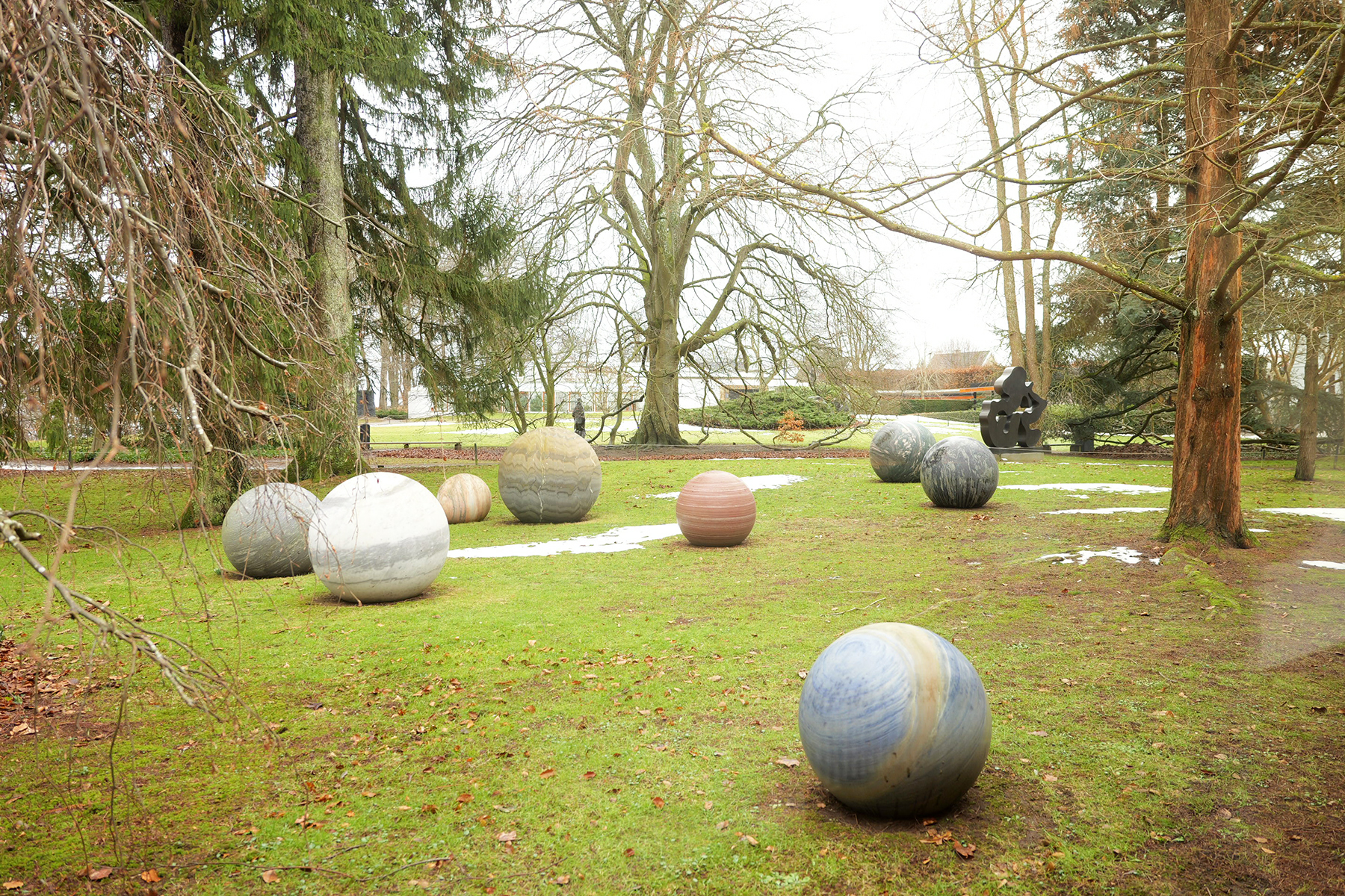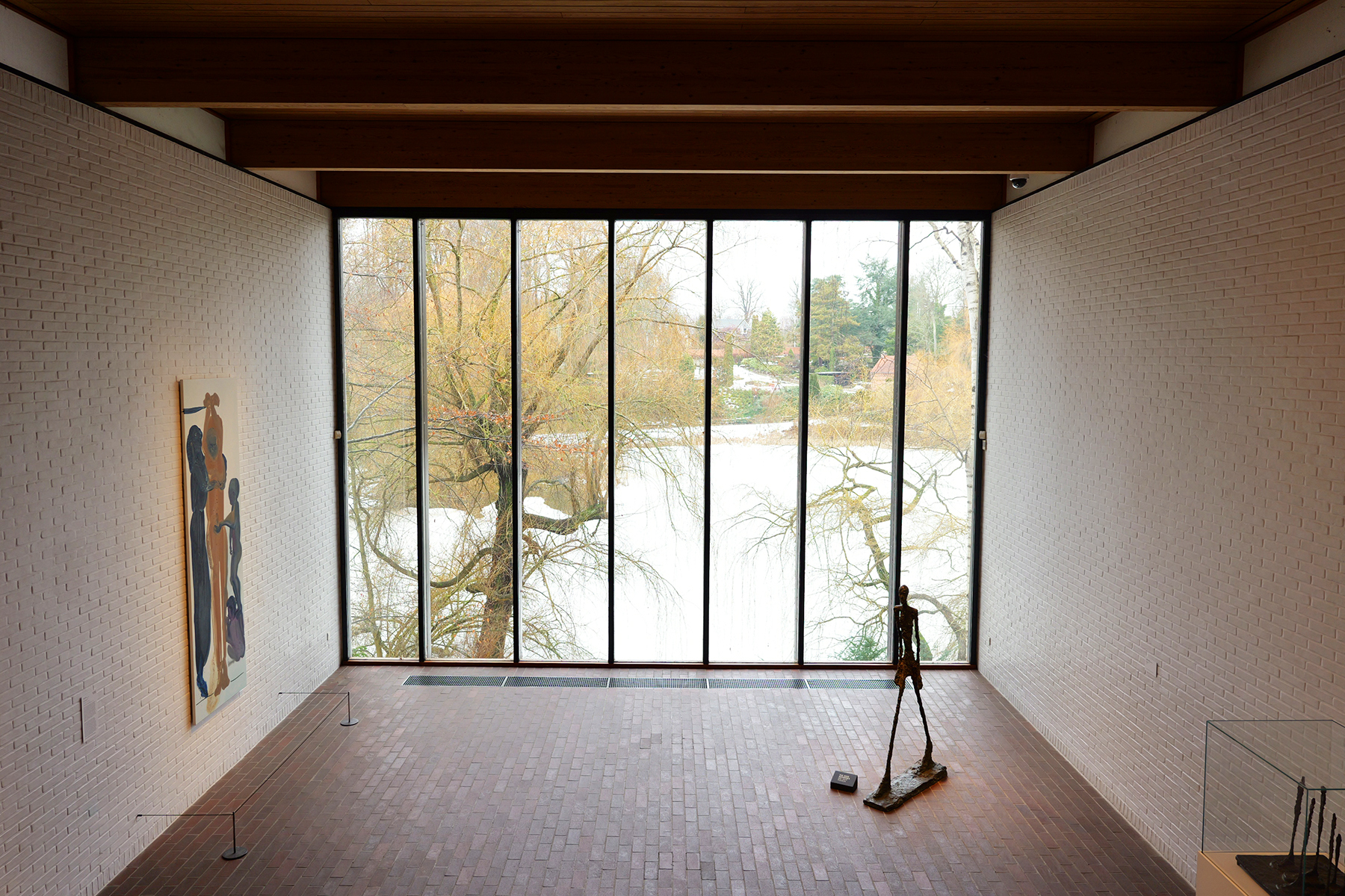 さらに進んで9時の方向にあるのが常設の「Giacometti Gallery」、部屋の先に広がる自然と一体となった素晴らしい空間。いつもは青々と繁る緑が主役ですが、今回は湖が凍っていることに釘付けでした〜。