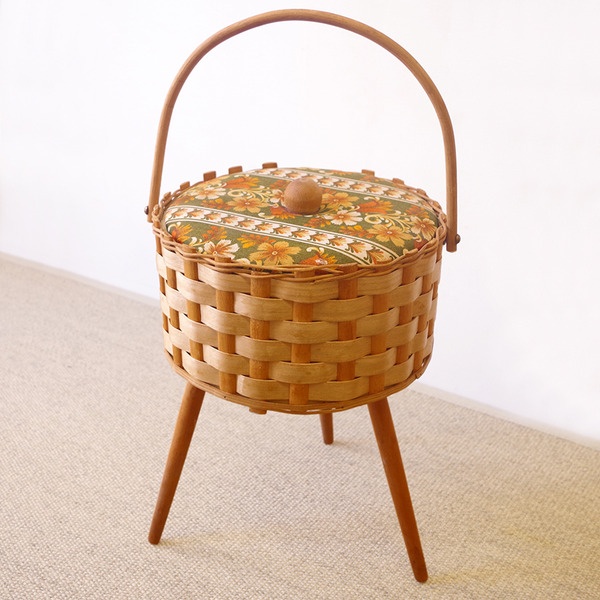 木材とラタンを組み合わせて編んだボックスに、なんとも雰囲気のあるファブリックの蓋がついた一台。内部はプラスチックの仕分けケースがついて、使い勝手も良さそうです。