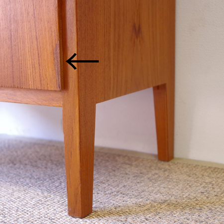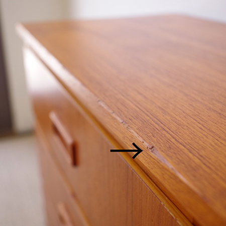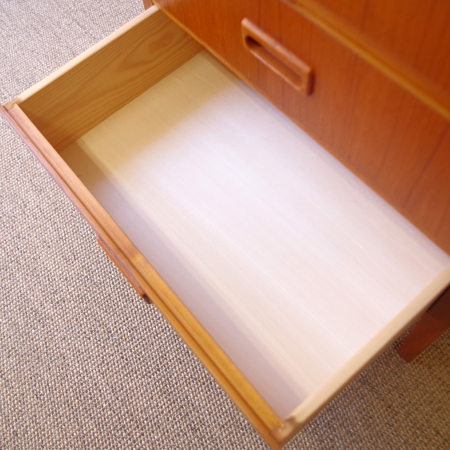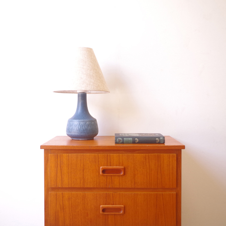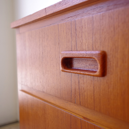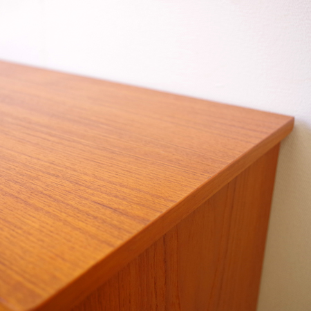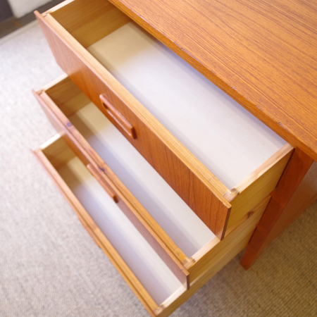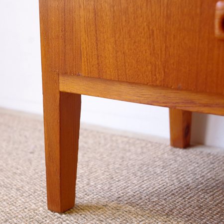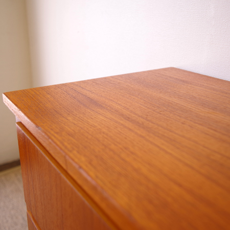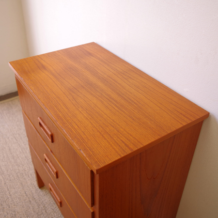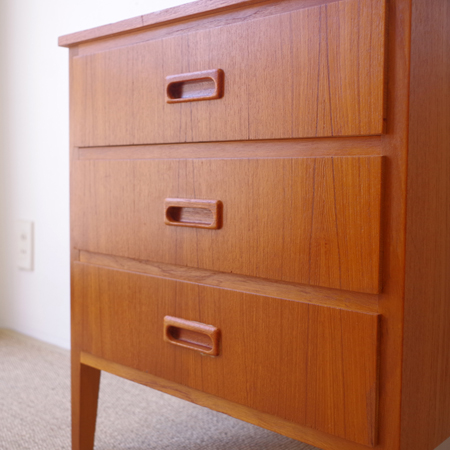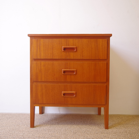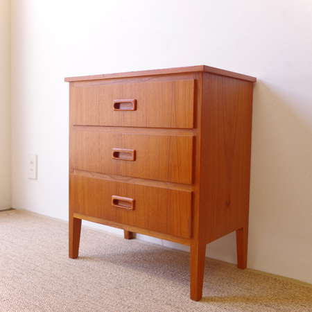 1960年代スウェーデン製の、ヴィンテージ3段チェストです。 脚部までが一体となったデザインが特徴となっており、3段チェストの中でも取り分け小ぶりなサイズ感です。明るめのチーク材の色味が部屋を明るく彩ってくれ、正面から見て上下に揃った杢目からも、丁寧に作られたヴィンテージらしさを感じることができます。 丁寧な修復を行いまして、良好な状態です。引出しの底板は新しく交換しておりますので、清潔にお使いいただけます。