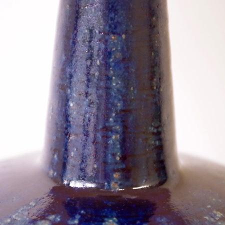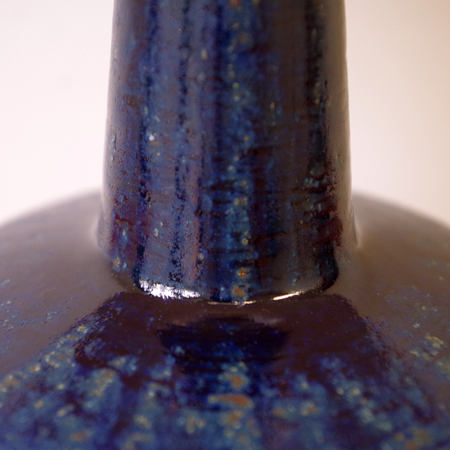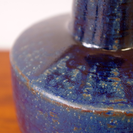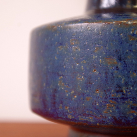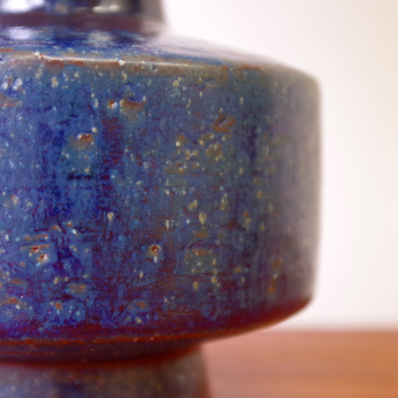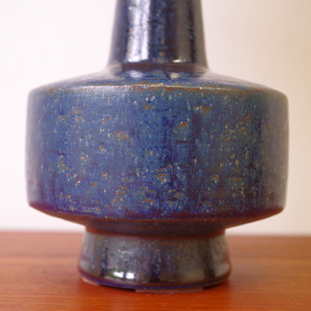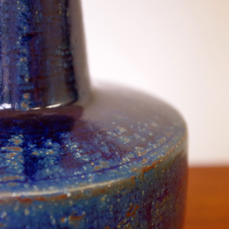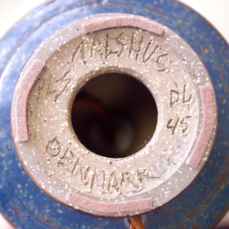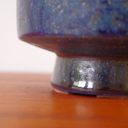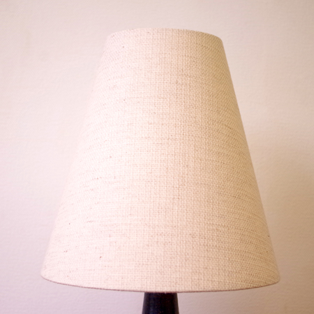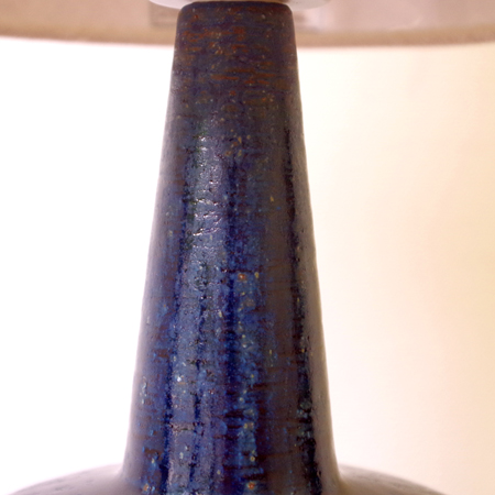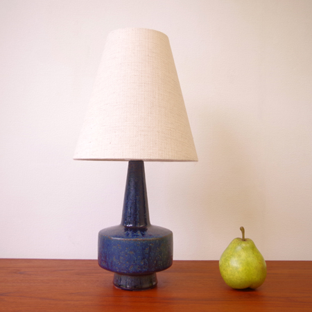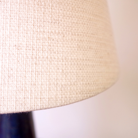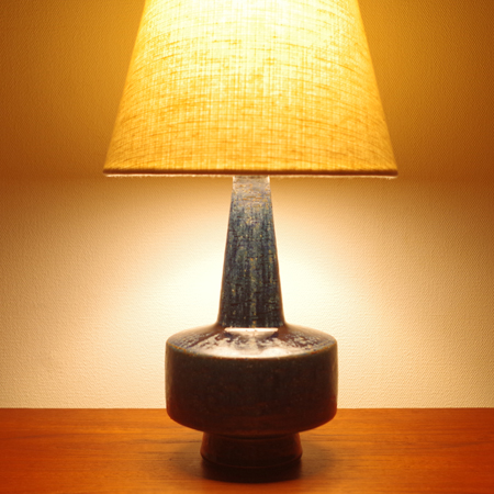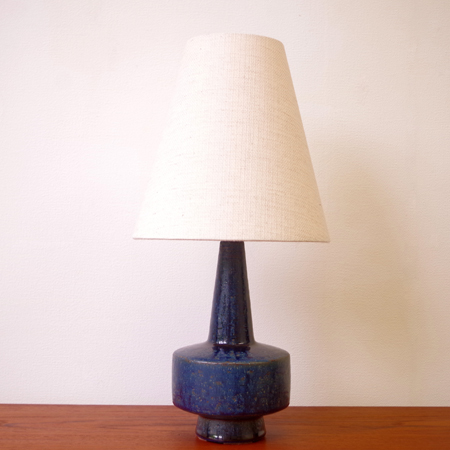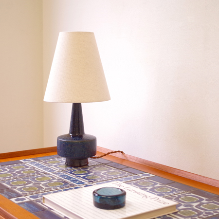 デンマークの名窯のひとつPalshus窯の陶製のベースを用いた、1960年代デンマーク製のヴィンテージ テーブルランプです。Palshus窯は1948年から1972年のわずか24年間シュミット夫婦が開いた窯で、その中〜後期の作品の特徴を捉えた作品です。藍色のグラデーションはまるで、移ろいゆく空を表しているようです。この落ち着いた色合いはどんなインテリアにも溶け込みやすく、和の空間にもすんなりと馴染んでしまうおおらかさがあります。 シェードは本体の形が美しく見えるように国内にてオーダーしたもので、明かりを灯すとコットンの風合いがまた違った表情を作り出してくれます。新しく交換したコードなども、ヴィンテージの風合いに合うデザインをセレクトました。 丁寧な修復を行いまして、とても綺麗な状態です。空間の雰囲気をぐっと高めてくれる観賞用としても素晴らしい品で、まず見かけない希少な柄となります。
