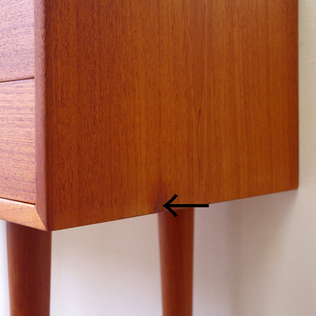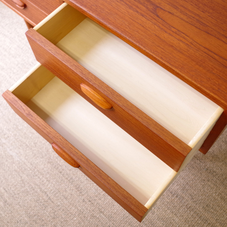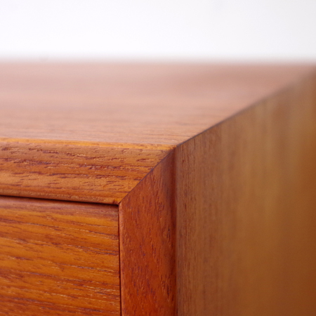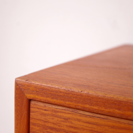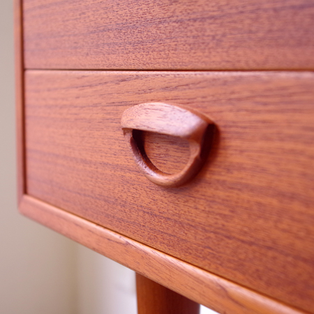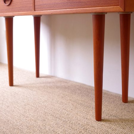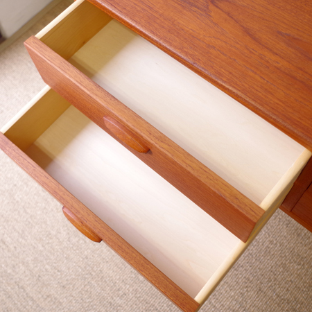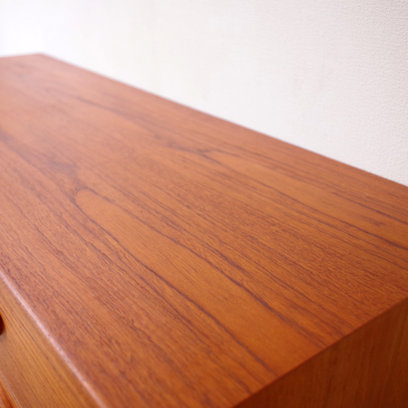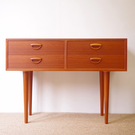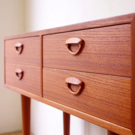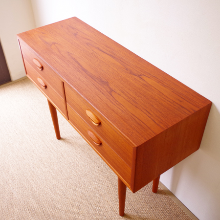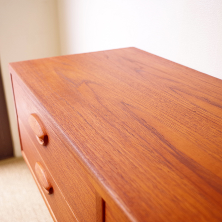 1950年代に活躍した家具デザイナーの一人、カイ・クリスチャンセン(Kai Kristiansen)がデザインしました2段チェストです。 すらりと伸びた長い脚が、他のチェストとは一線を画すデザインです。奥行きがないために圧迫感を感じさせなず、どのような空間にもすっと馴染んでくれます。特徴的な取っ手は指がかりもよく、デザインと実用性を兼ね備えています。脚部まで全てこの時代ならではの良質なチーク材が用いられています。 リビングの片隅に置くだけで、目を惹く存在感があります。天板に小物などを飾って、お気に入りのワンコーナーを作っても素敵です。 丁寧な修復を行いまして、全体として良好な状態です。引き出しの底板も交換しておりますので、清潔にお使いいただけます。サンディングで落としきれなかった小キズ、側面に古い補修箇所がございます。いずれも気にならない程度ですが、それらを考慮した価格となっております。詳しくは画像にてご確認ください。