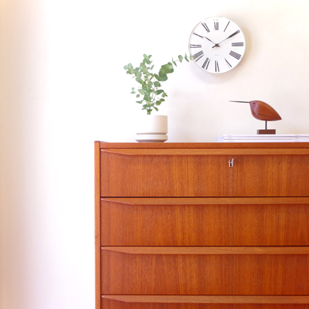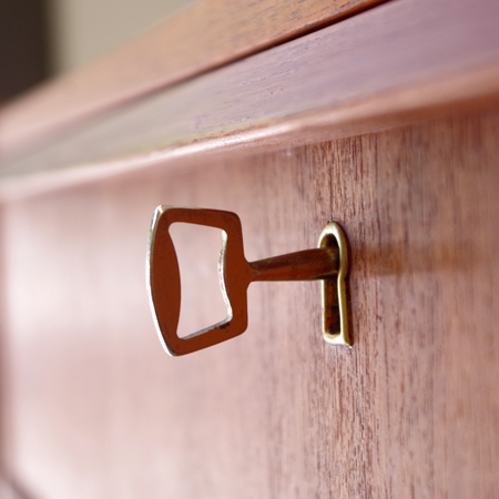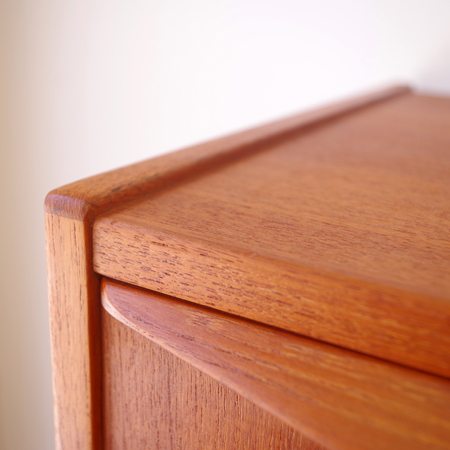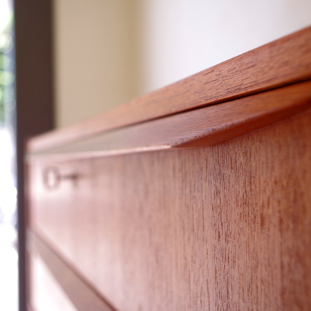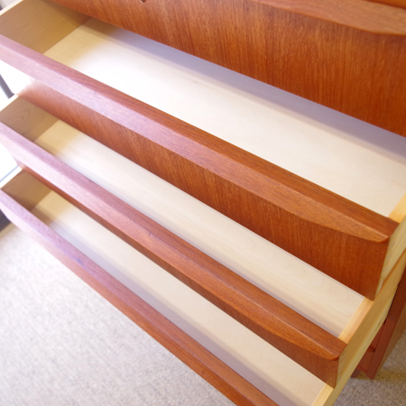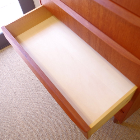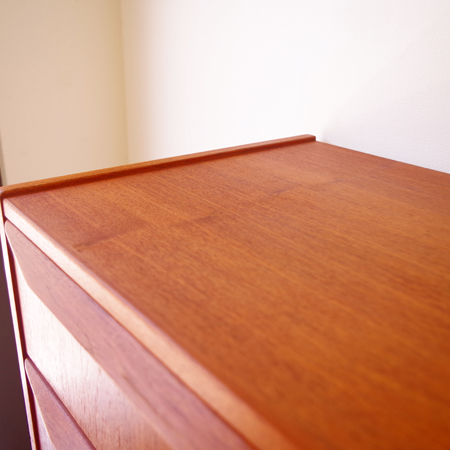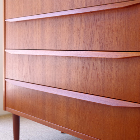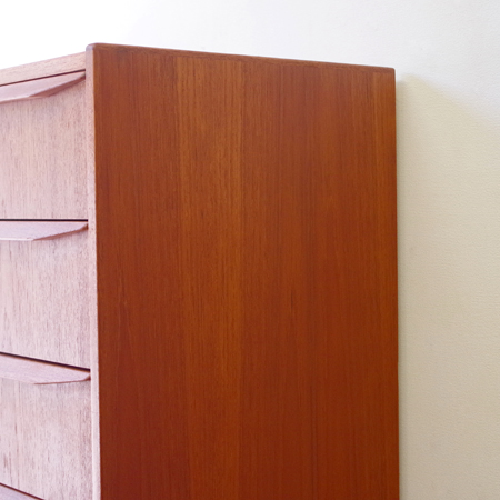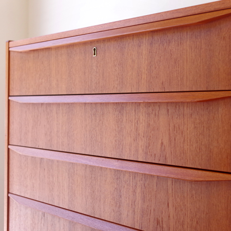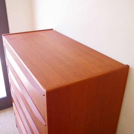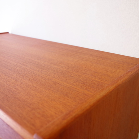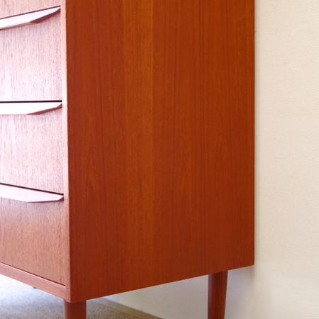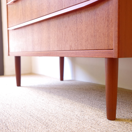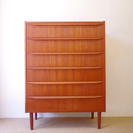 1960年代デンマーク製の、ヴィンテージ鍵付き6段チェストです。引出しの縁に沿って付けられた厚みのあるチーク無垢材の取っ手は指掛かりも良く、バータイプですっきりとした印象を与えてくれます。また正面から見て上下に揃った杢目も、丁寧に作られたデンマーク製のヴィンテージらしさのひとつです。 確りとした収納力を備えており、衣服などをたっぷりと収納していただけます。そして高さも程よく広い天板には、小物をディスプレイして楽しむことができます。引出しの最上段には鍵が付属しておりますので、貴重品などの保管にも良さそうです。 丁寧な修復を行いまして、全体的に綺麗な状態です。引出しの底板は全て新しく交換しておりますので、清潔に気持ち良くお使いいただけます。詳しくは画像にてご確認くださいませ。