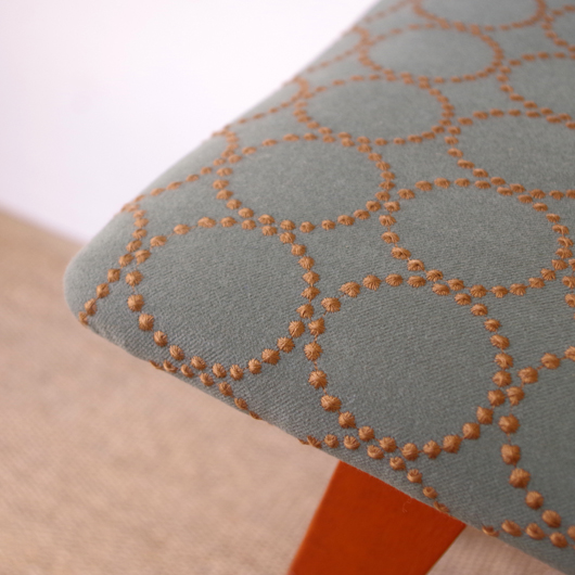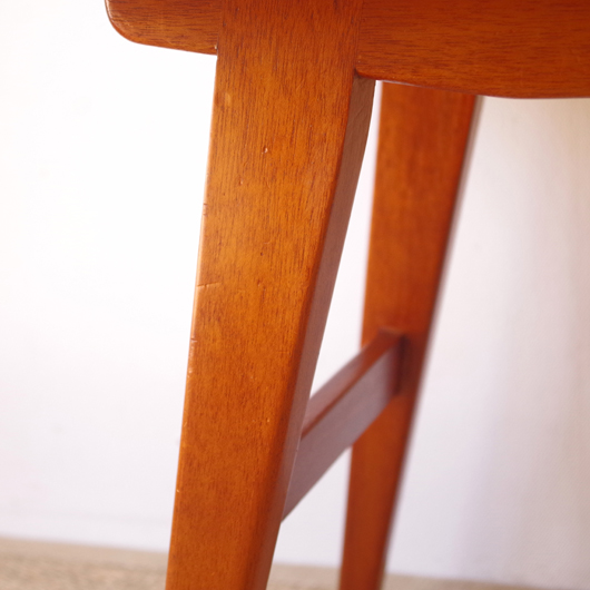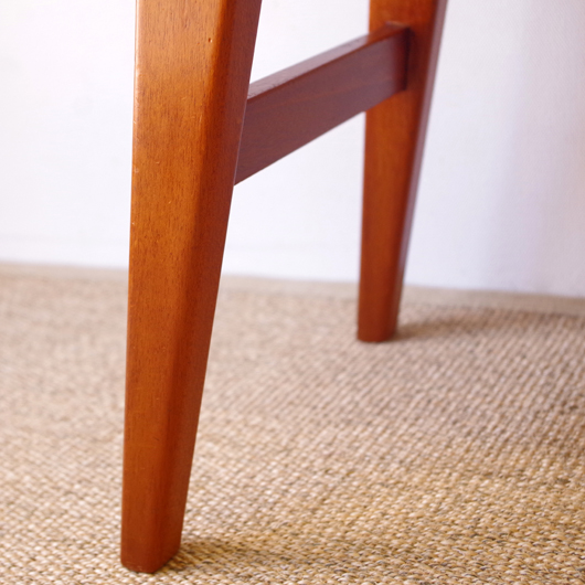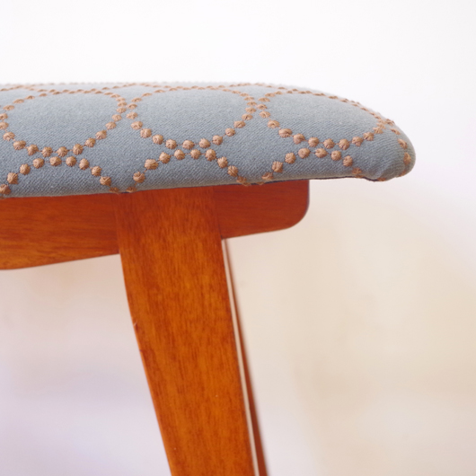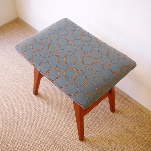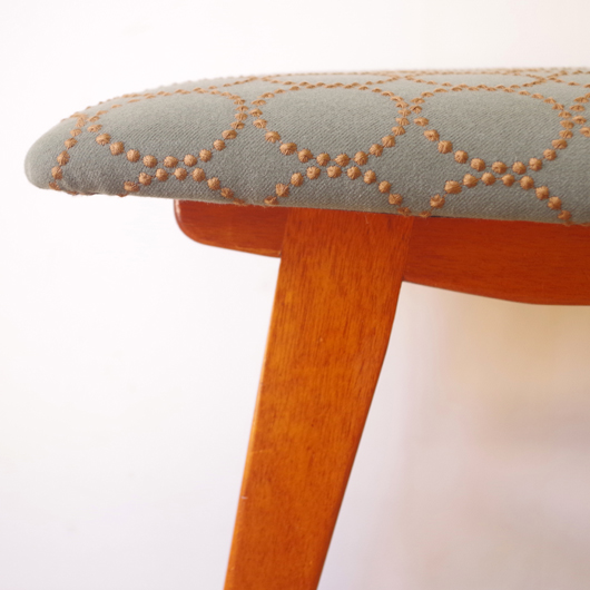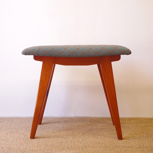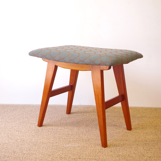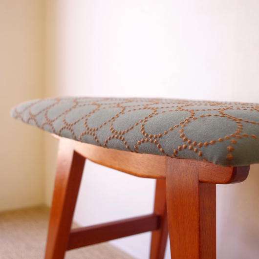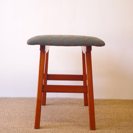 1960年代デンマーク製の、ヴィンテージスツールです。座面はmina perhonenのファブリックdop tambourineにて張り替えました。スモーキーグリーンの生地にブラウンの刺繍が施された落ち着いた配色で、物語性のあるファブリックがチーク材のフレームを引き立ててくれます。直線で構成されながらも微妙な角度をつけることでエレガントさを出す脚部に、高いデザイン性を感じることと思います。 玄関先に置いて靴を履く時に使用したり、ビューローなどに合わせるのも良さそうです。空間にやさしい雰囲気を作り出してくれることと思います。 丁寧な修復を行いまして、綺麗な状態です。張替えの際には内部のウレタンも合わせて交換しておりますので、座り心地も良好です。脚部にわずかな小キズがございますが、雰囲気を損なわない程度のものです。詳しくは画像にてご確認ください。