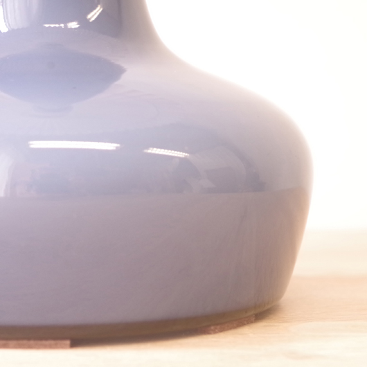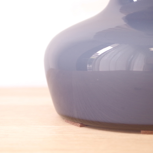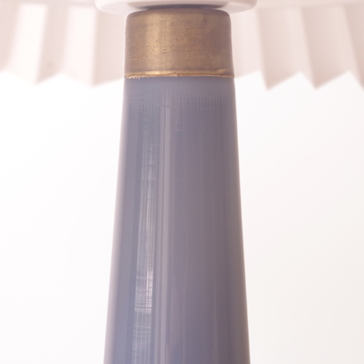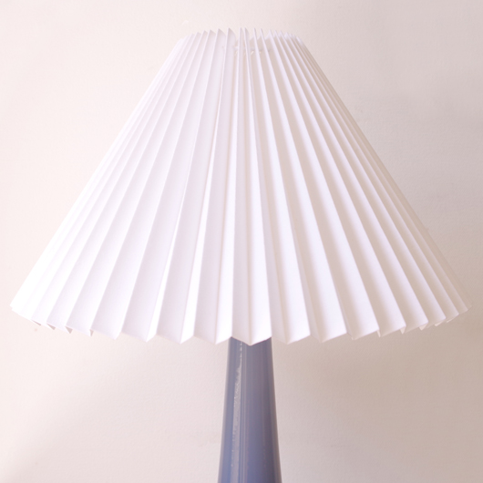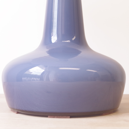 1825年創業の老舗ガラスメーカーHolmegaard社製造、デンマーク近代デザインの巨匠Kaare Klintを父に持つ、Esben Klintが1958年にデザインしましたテーブルランプ。真鍮製の首のしたからスッと伸び、ベースに向かうにつれてぷっくりと膨らんだフォルムが印象的です。こっくりとした艶のあるペールブルーは、空間にそっと華を添えてくれることと思います。高さもあり、サイドボードの上に設置して絵やポスターなどと合わるのにも丁度良いサイズ感ではないでしょうか。 合わせたシェードはデンマーク製の新しいもので、光を灯すとプリーツが美しい陰影を作り出してくれます。新しく交換したコードなども、ヴィンテージの風合いに合うデザインをセレクトました。 電気工事士の資格を持つ職人によりソケット・コード・プラグ等の電気に関わる部分は全て交換し、電気用品安全法に基づいた点検なども行いPSEマークを表示しておりますので、新しいもの同様に安心してご使用いただけます(詳しくは下記をご覧ください)。僅かな小キズやスレなどみられますが、まず気にならない程度ものもかと思います。全体的として綺麗な状態です。詳しくは画像をご確認ください。