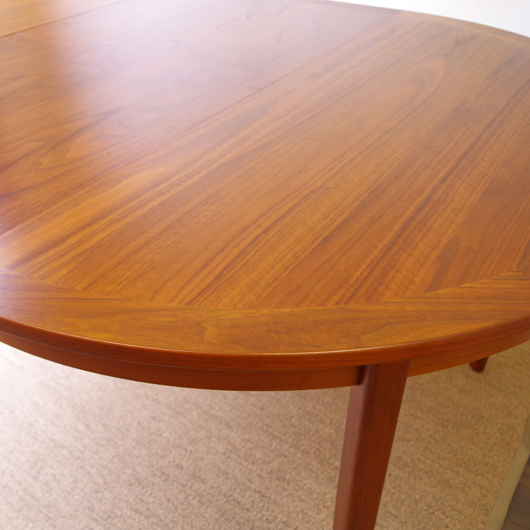 1950~60年代デンマーク製のエクステンション式ラウンドテーブルです。 円形の天板のエッジには縁取りが施され、木目によってデザインのアクセントを作り出しています。通常は円形4人掛けのダイニングテーブルとして、エクステンション(伸張)板を使用するとオバール型の6人掛けとしてご使用いただけます。天板の下に伸張板が内蔵されておりますので、収納場所をとりません。 フルサンディングを行った後、再塗装を行いました。自然な艶のとても良い雰囲気に仕上がっています。多少の水濡れにも問題のない塗装を施しておりますので、小さなお子様のいるご家庭でも安心してご使用いただけます。天板はできる限り色味を合わせましたが、ほとんど使われていなかったエクステンション板と若干の差異が見られます。詳しくは画像にてご確認ください。