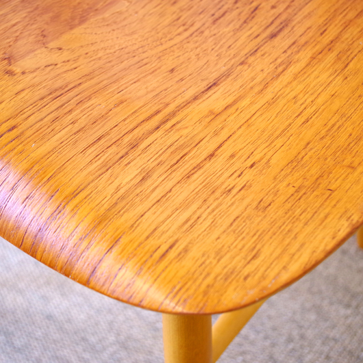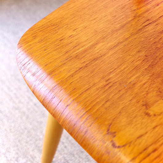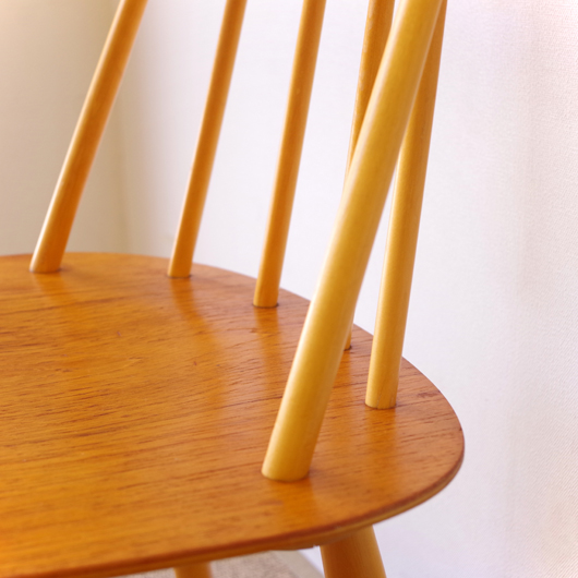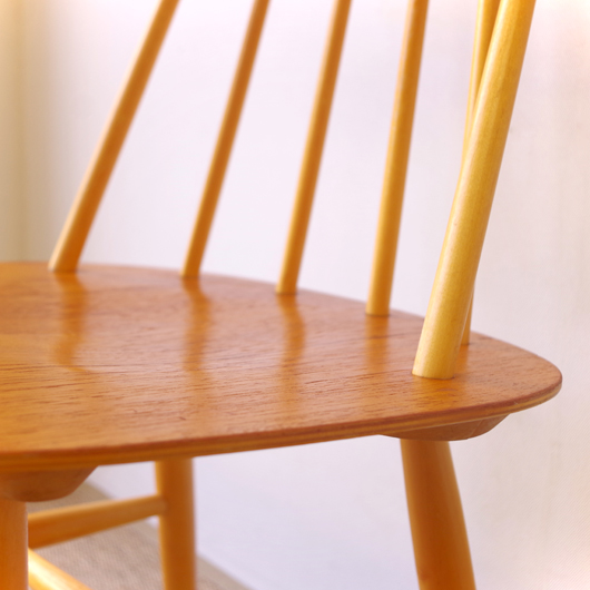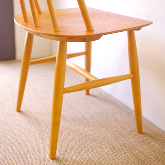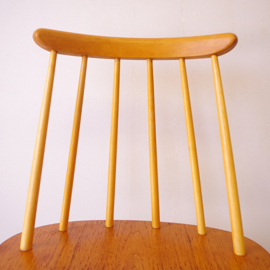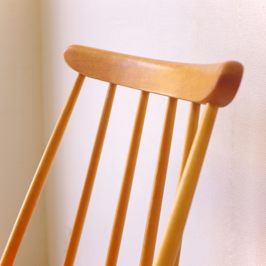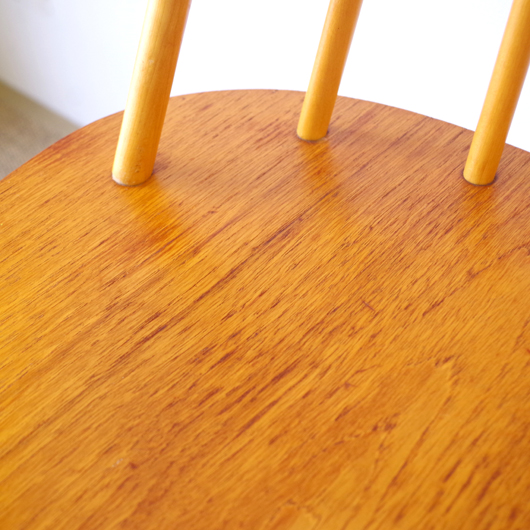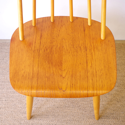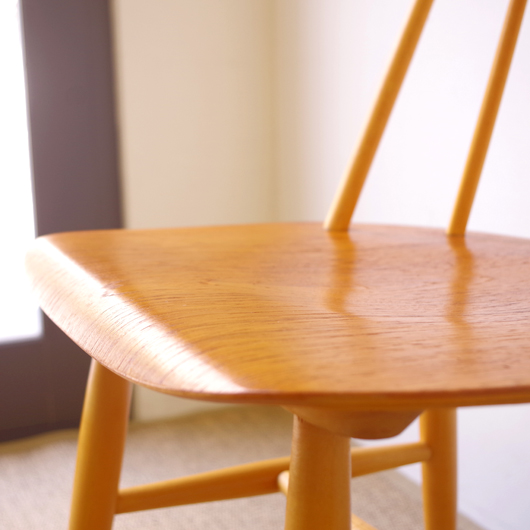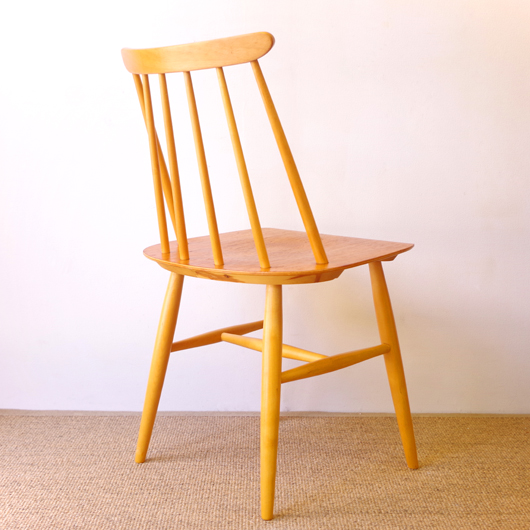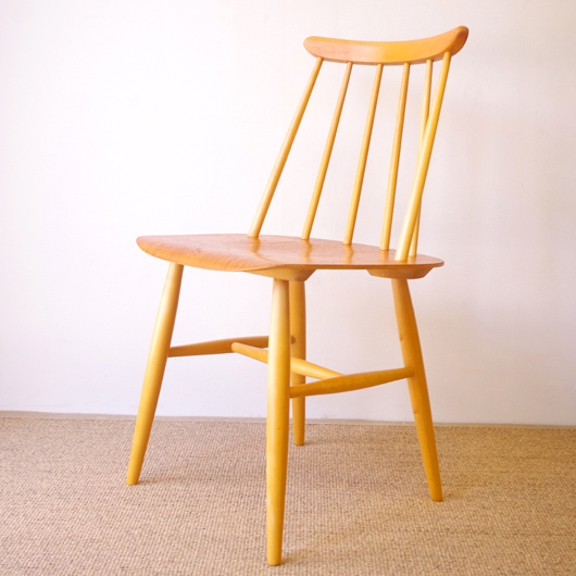 イルマリ・タピオヴァーラが1955年にデザインしました、スウェーデンEDSBY VERKEN社製のFanett Chair55Tです。 絶妙な角度の付いた6本のスポークがふわりと背を支えてくれる、シンプルながら計算されたデザインです。座面を見ましても、お尻の部分にはくぼみがつけられていたり、膝裏の当たる部分は緩やかなアールを描いていたりと、座り心地もよく考えられていることが分かります。 タピオヴァーラのデザインしたチェアの中でも特に人気があり、復刻されていないためにヴィンテージでしか手に入らないモデルとなります。 打ちキズなどは所々に見られますが、雰囲気を損ねず良い味わいとなっております。詳しくは画像にてご確認ください。