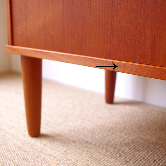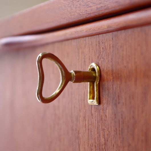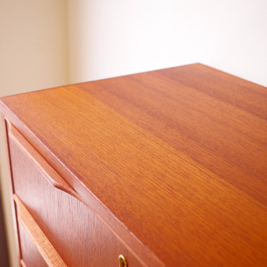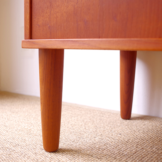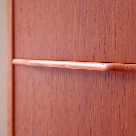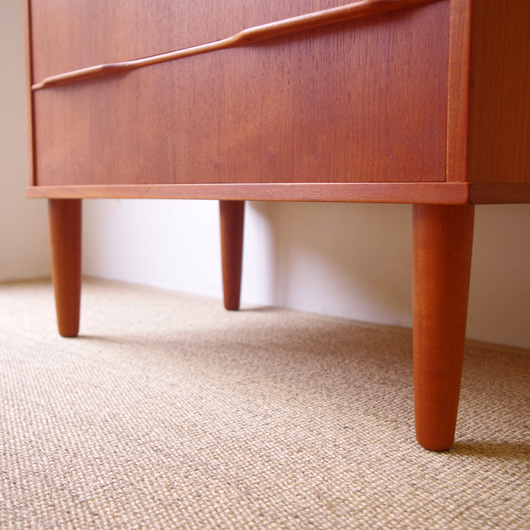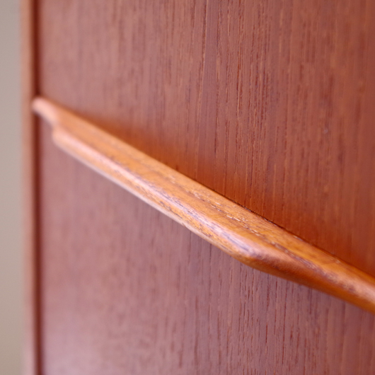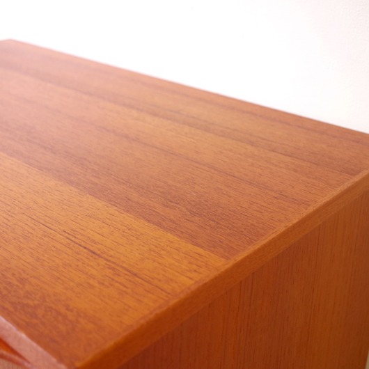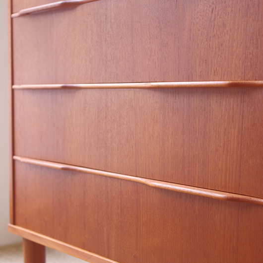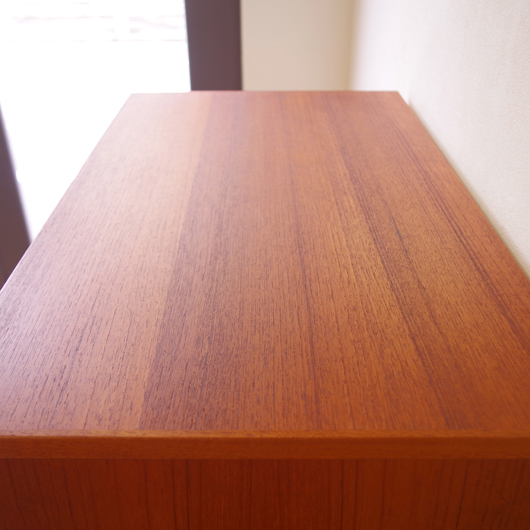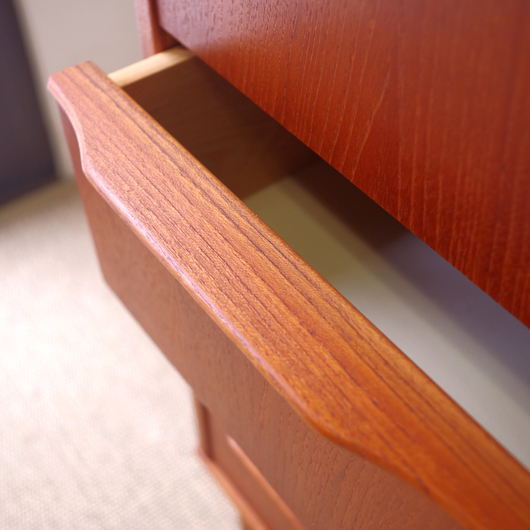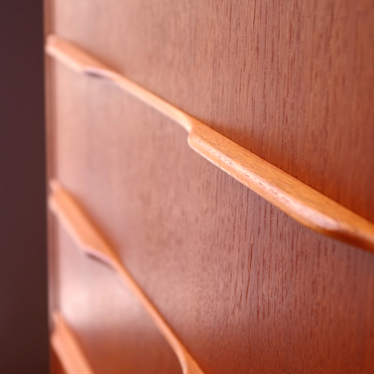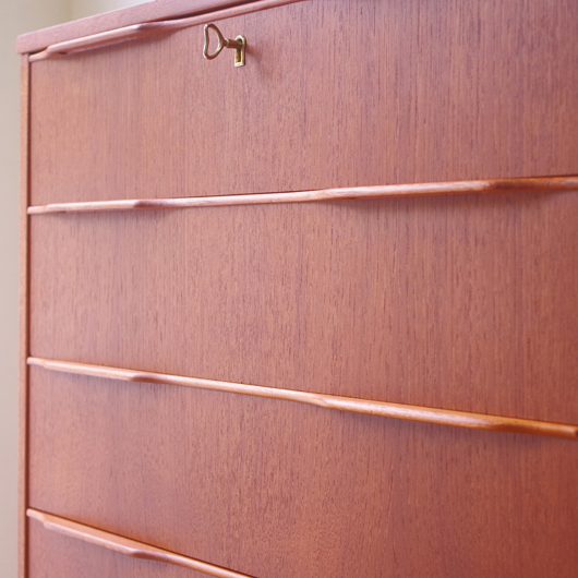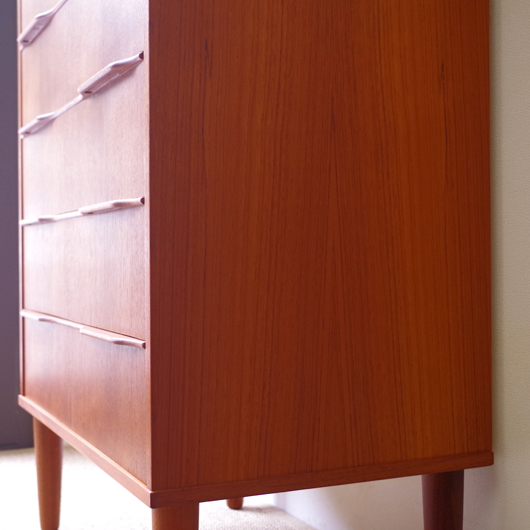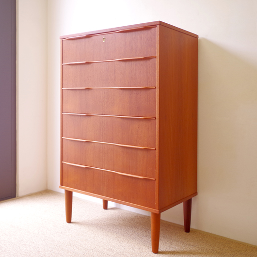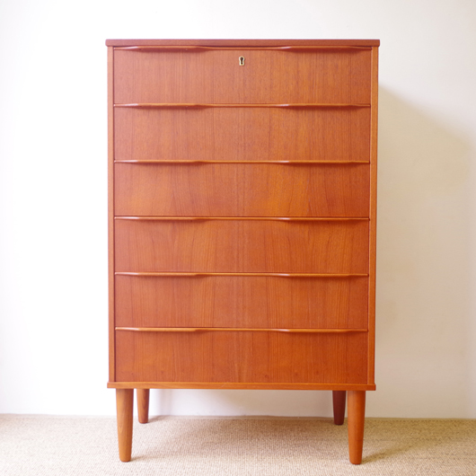 1960年代デンマーク製の、ヴィンテージ6段チェストです。縁に沿って取り付けられたチーク無垢材の取っ手は、指がかりが良いような丁寧な仕事がなされています。テーパーのかかった端の処理など、さりげないデザインで全体をまとめ上げています。また正面から見て上下に揃った杢目も、丁寧に作られたデンマーク製のヴィンテージらしいポイントのひとつです。 引出しの最上段には鍵が付属しておりますので、貴重品などの保管にも良さそうです。目線の高さに天板があるので、照明や小物を飾ってお楽しみいただけます。 丁寧な修復を行い、非常に綺麗な状態です。引出しの底板は全て新しく交換しておりますので、清潔に気持ち良くお使いいただけます。詳しくは画像にてご確認ください。