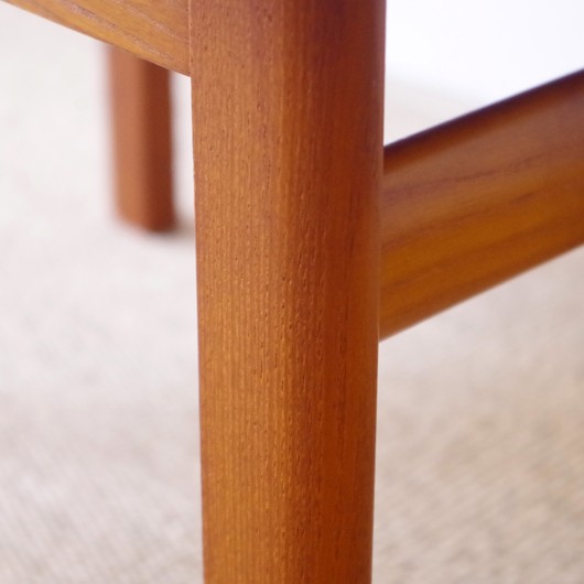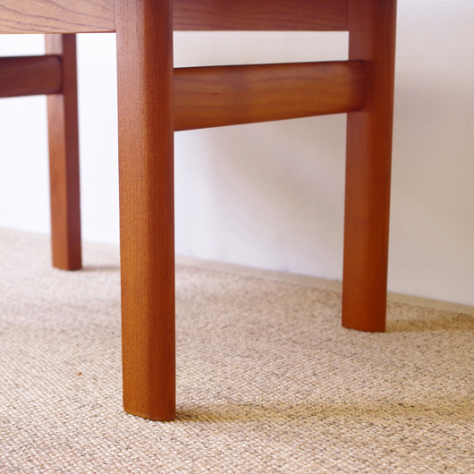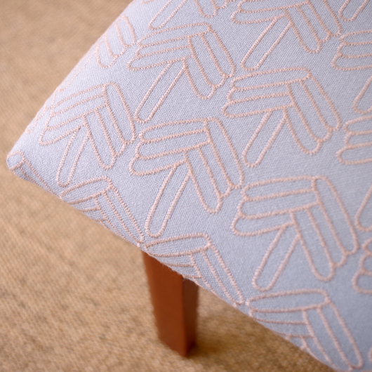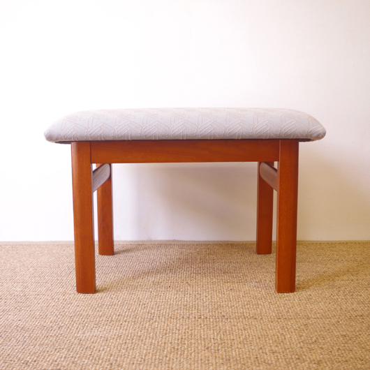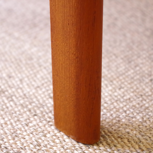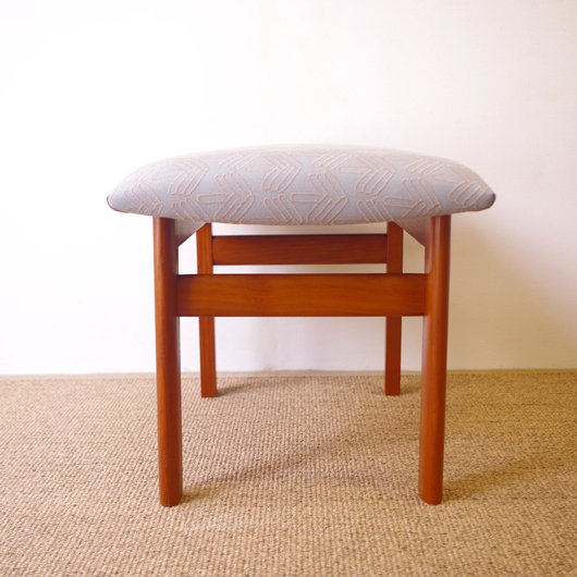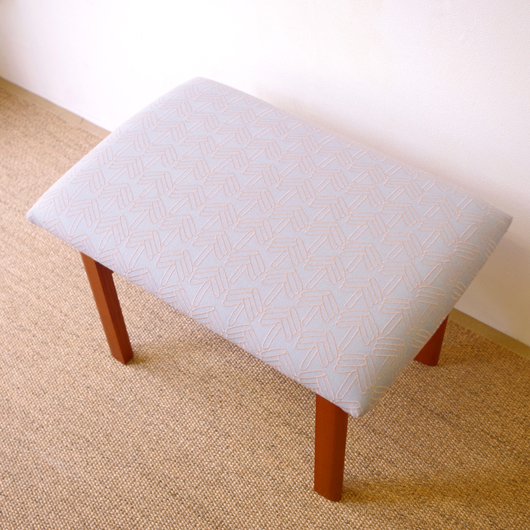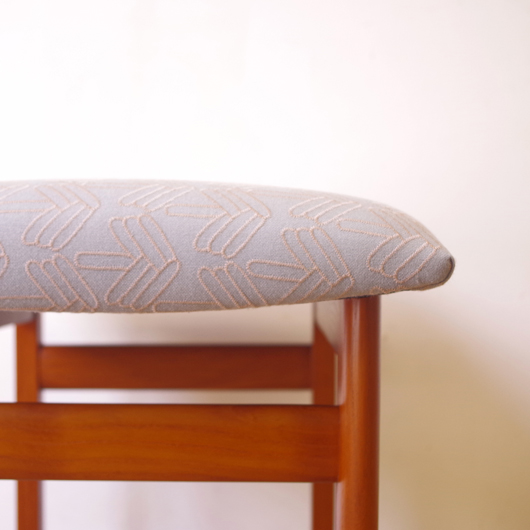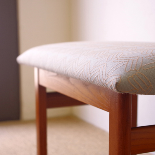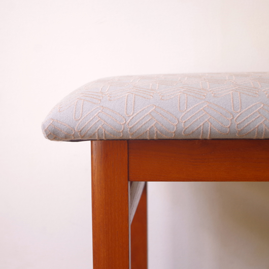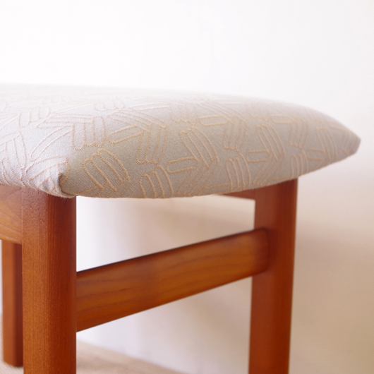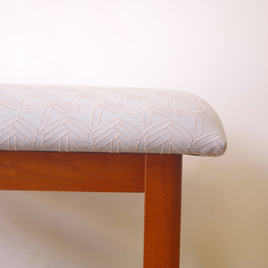 1960年代デンマーク製の、ヴィンテージスツールです。アーモンド型の特徴的な形状をした座面を、張り替えの際に忠実に再現しました。そして外側のみ角を落とした脚部は、さりげない中にも計算されたフォルムであることを感じます。 座面の生地はmina perhonenのデザイナー皆川明氏とデンマークを代表するテキスタイルメーカーkvadratがコラボレーションをした、新しいファブリックStick Treeを使用しました。爽やかな水色にベビーグレーの糸でスティックを組み合わせて木の模様を刺繍しています。 玄関先に置いて靴を履く時に使用したり、リビングやダイニングに置いても部屋のインテリアのアクセントとなることと思います。 丁寧な修復を行いまして、きれいな状態です。張替えの際にはもちろん内部のウレタンも合わせて交換しておりますので、座り心地も良好です。詳しくは画像をご覧ください。