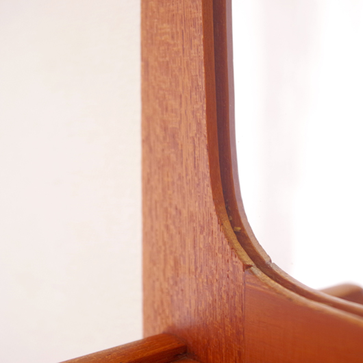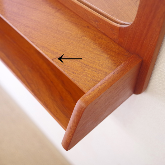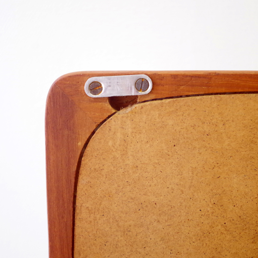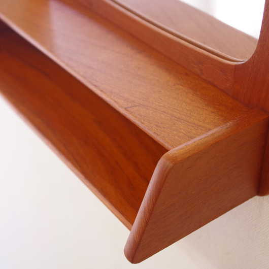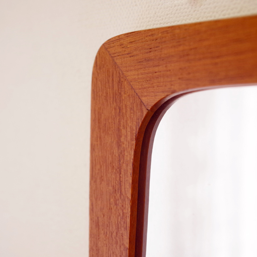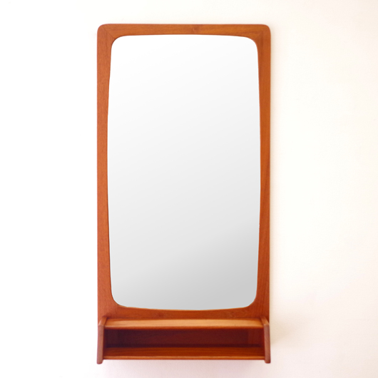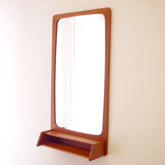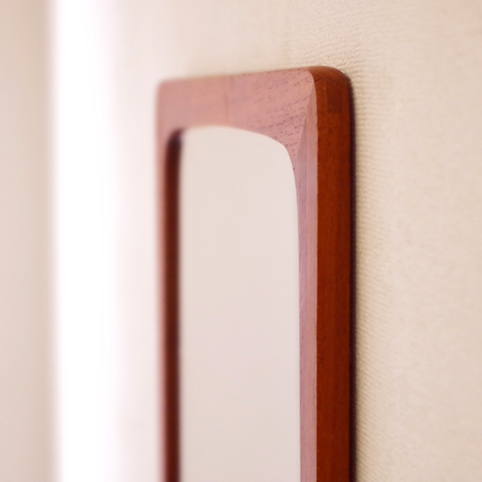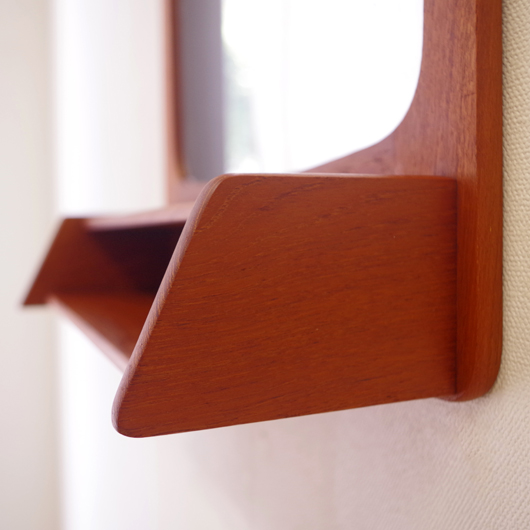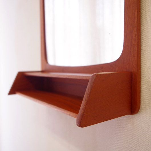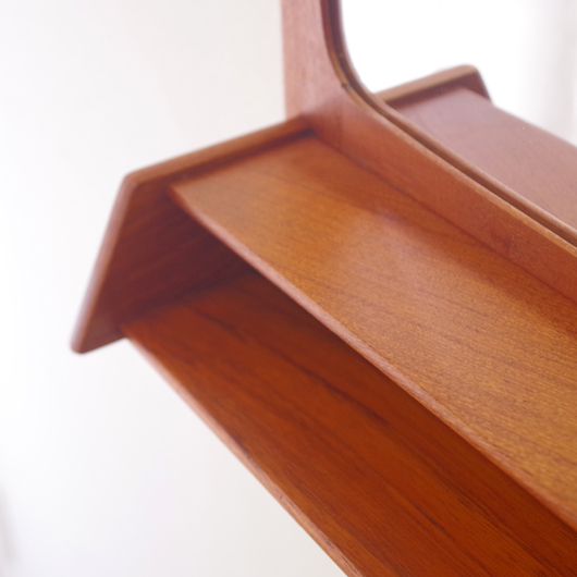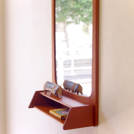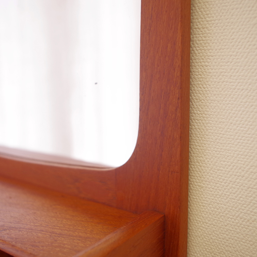 1960年代デンマークPedersen & Hansen製の、ヴィンテージ壁掛ミラーです。素材にはチークの無垢材が用いられており、角を落としたすっきりとしたデザインゆえにヴィンテージのチーク材の良さが引き立ちます。ミラーの下にはオープンの棚が付いており、側面が斜め切り出された使い勝手の良さが特徴です。 寝室に取り付けてヘアブラシなどとセットにして身だしなみを整えたり、玄関先で鍵の置いたり花瓶などの飾り棚にしたりと、様々な使い方が思い浮かびます。 丁寧な修復を行い、全体的に綺麗な状態です。鏡面にわずかにくもりなどがありますので、ご希望により交換も承らせていただきます(お見積もりをさせていただきますので、事前にメールにてお問い合わせください)。詳しくは画像にてご確認ください。