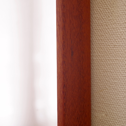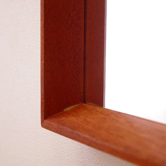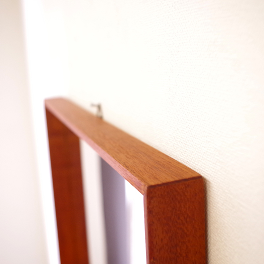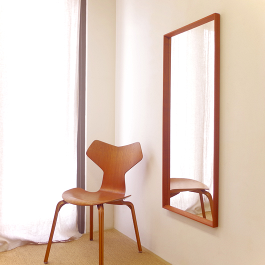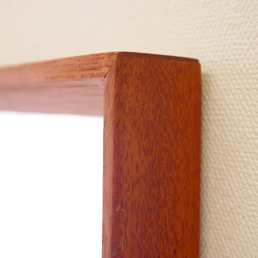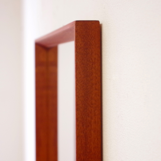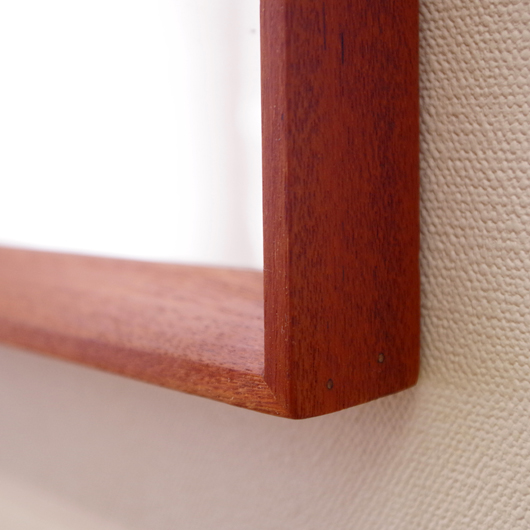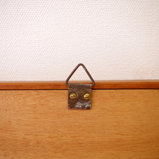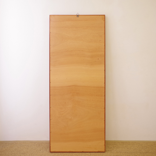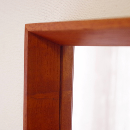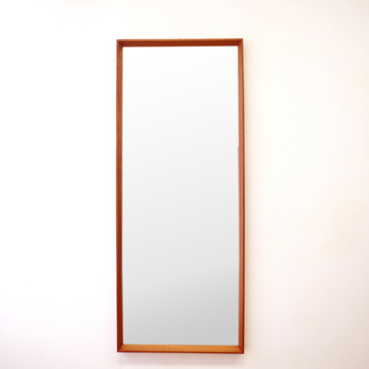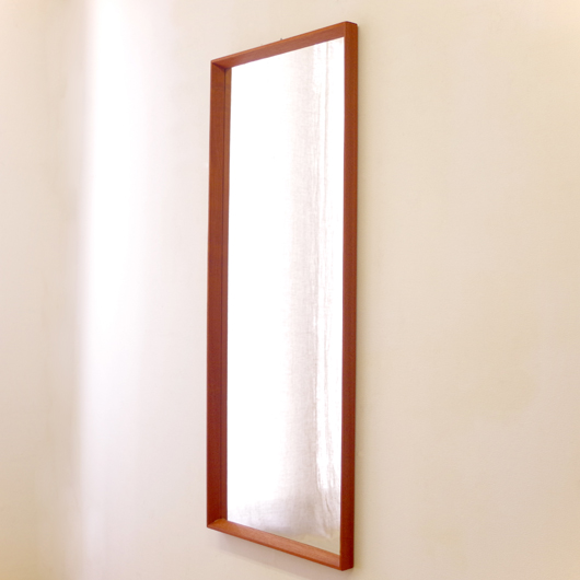 1960年代デンマーク製の、ヴィンテージ壁掛けミラーです。チーク材を用いたすっきりとした縦長のシルエットで、他のインテリアにもすっと馴染んでくれます。奥行きのあるしっかりとしたフレームは深いエッジの効いたもので、壁面にリズムをもたらしてくれることと思います。 高さ100cmを超える大きなサイズで、姿見としてご使用いただける十分な大きさです。裏面に取り付け金具が付いているので、フックやビスに引っ掛けて壁付けにしたり、もちろん床置きでもお使いいただけます。玄関先や寝室などで、毎日の暮らしにそっと寄り添ってくれることと思います。またこのサイズは、置いておくだけで空間を広く見せてくれる効果もあります。 丁寧な修復を行いまして、全体として綺麗な状態です。鏡面にわずかに腐食が見られますので、ご希望により別途料金にて鏡面の交換を承ります。ご希望の方はお見積もり致しますので、事前にお問い合わせください。