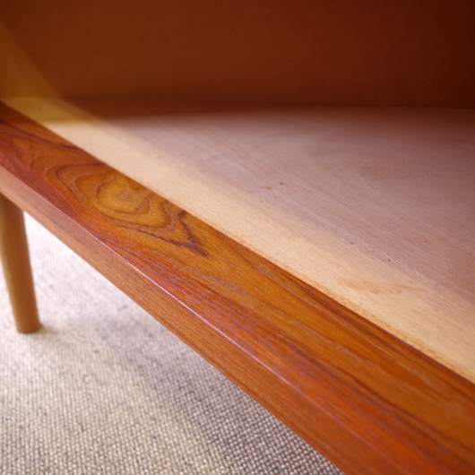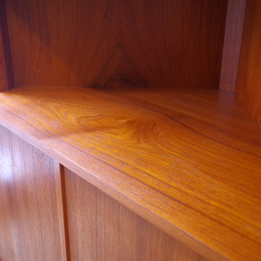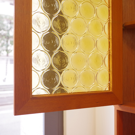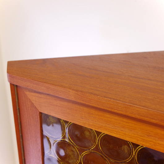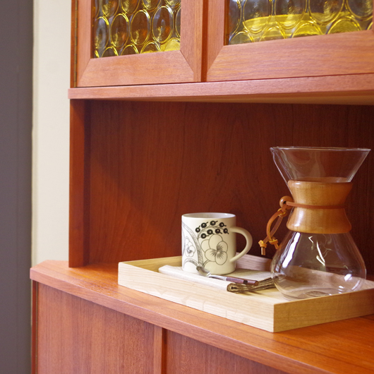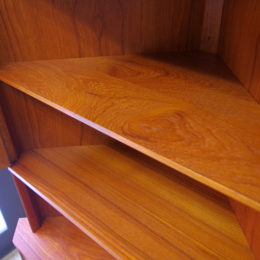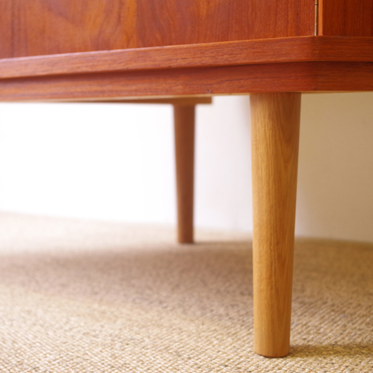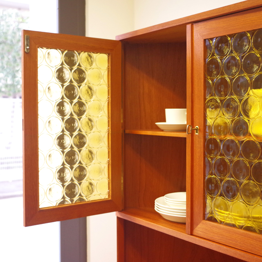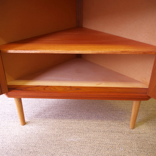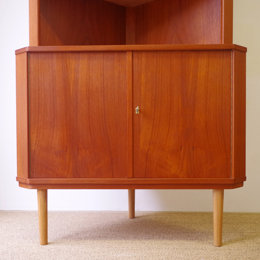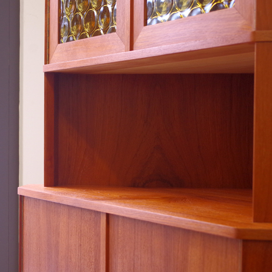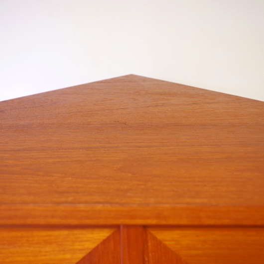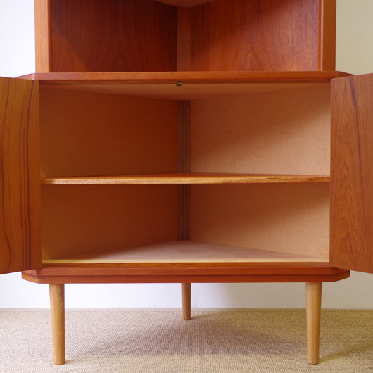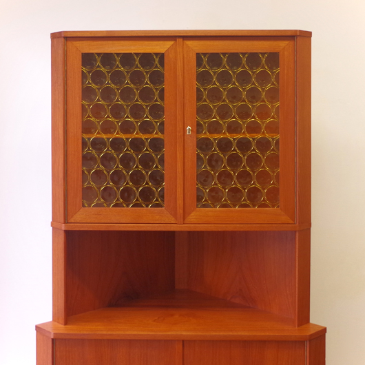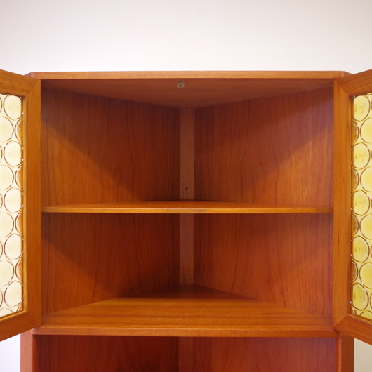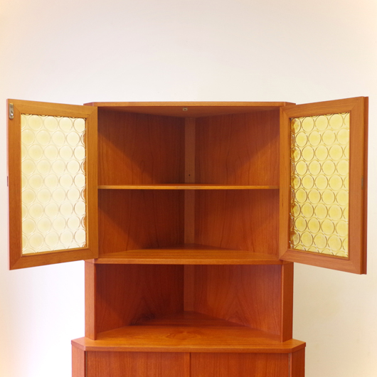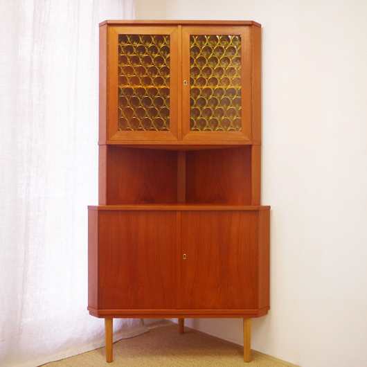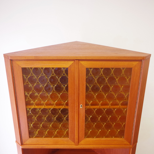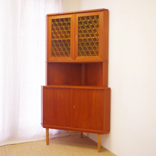 1960年代デンマーク製のヴィンテージ コーナーキャビネットです。部屋のコーナーにぴったりとフィットする、三角柱に3本脚のついた形をしています。一番の特徴は上部扉のデザインではないでしょうか。当時のデンマーク製キャビネットにガラスが使われることは多くはなく、光に透かすと琥珀色をしたガラスが水面の波紋のような模様を見せてくれます。中には可動式の棚板が一枚付いた収納部となります。その下はオープンスペースとなり、下部は木製扉の収納部で、同じく可動式の棚板が一枚付きます。ヴィンテージらしさを感じながらもすっきりとモダンな印象を受けるバランスのとれたデザインは、現代のものにはない味わいを持っています。 ダイニングに置いて食器を収納したりと、見せる収納にいかがでしょうか。オープンスペースにはオーブントースターやコーヒーメーカーなど電化製品を置いても、コードを横から逃がすことができて便利です。デッドスペースを有効活用でき、一台でお部屋の雰囲気を変えてくれるスペシャルな一台です。 丁寧な修復を行いまして、全体的に綺麗な状態です。ガラスの当時のオリジナルですが、とても綺麗な状態を保っています。詳しくは画像にてご確認ください。