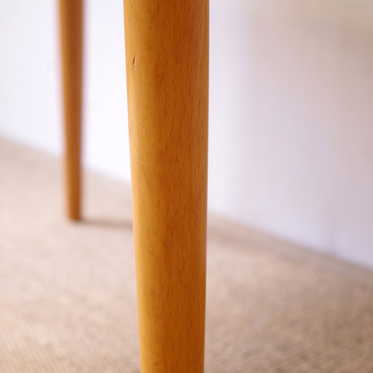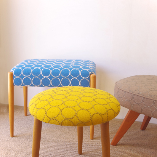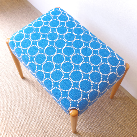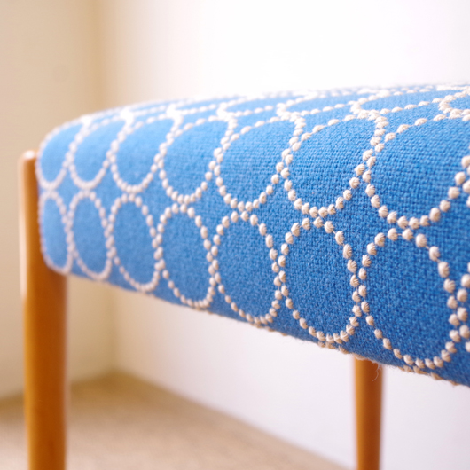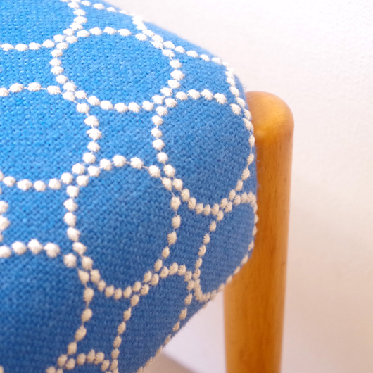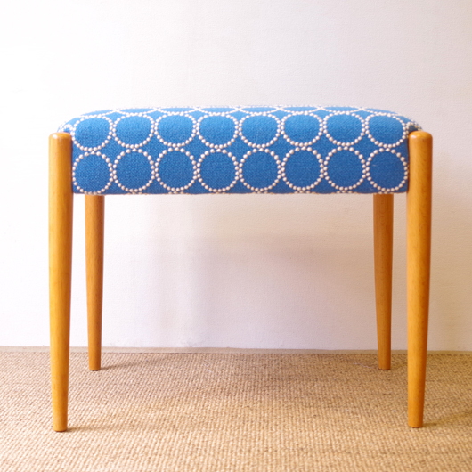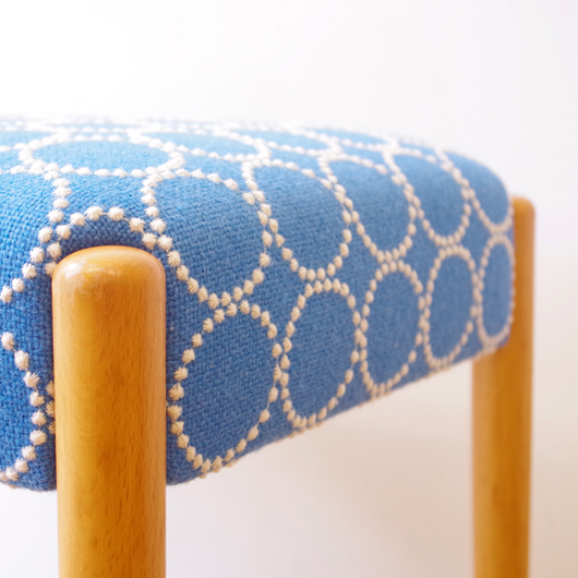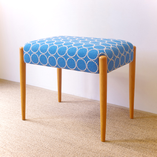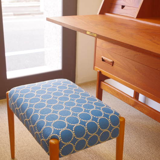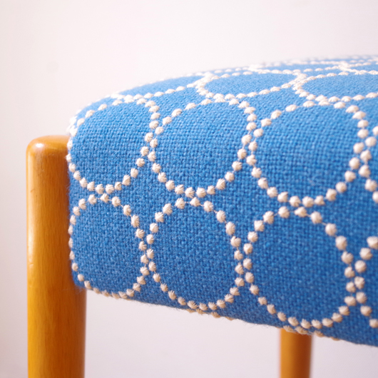 1960年代デンマーク製の、ヴィンテージスツールです。長方形の座面のサイドからすらりと脚部が伸び、すっきりとした印象を与えてくれます。座面の張り替えには、デンマークの老舗メーカーKvadrat社の生地を用いました。Hallingdalシリーズにmina perhonenの刺繍を施したコラボレーション生地Hallingdal tambourineのブルーに、ホワイトの糸で刺繍を施してあります。 玄関先に置いて靴を履く時に使用したり、リビングに置いて来客用の簡易チェアとしていかがでしょうか。またライティングビューロー用のスツールとして、書き物などをする時に合わせてお使いいただくもの良さそうです。部屋の中に溶け込みつつも、置いておくだけでパッと目を引くインテリアの主役になってくれそうです。 丁寧な修復を行い、綺麗な状態です。詳しくは画像にてご確認ください。