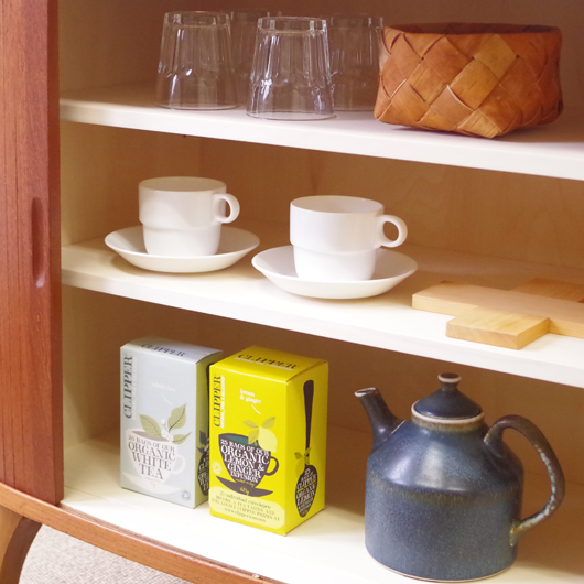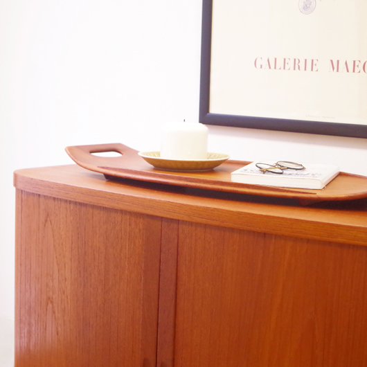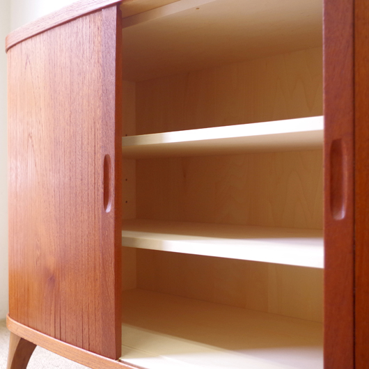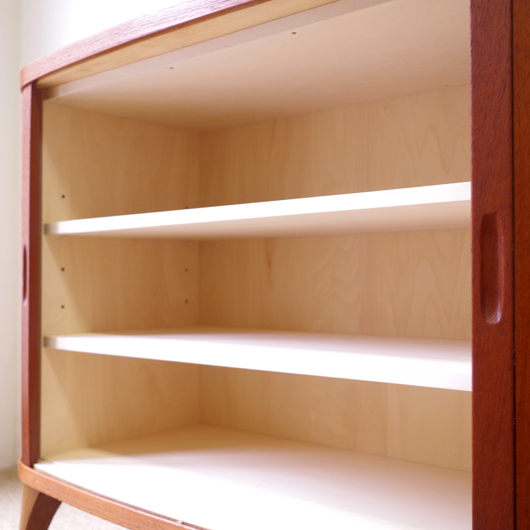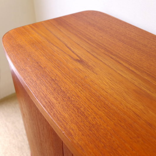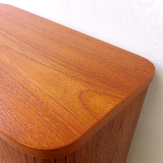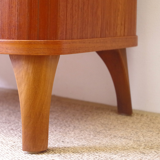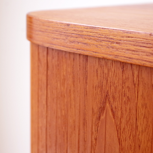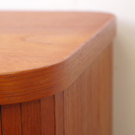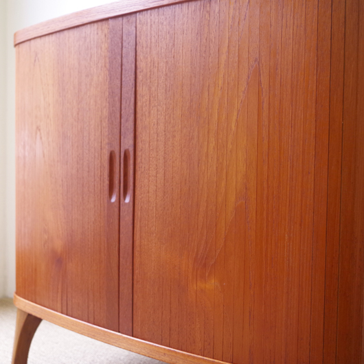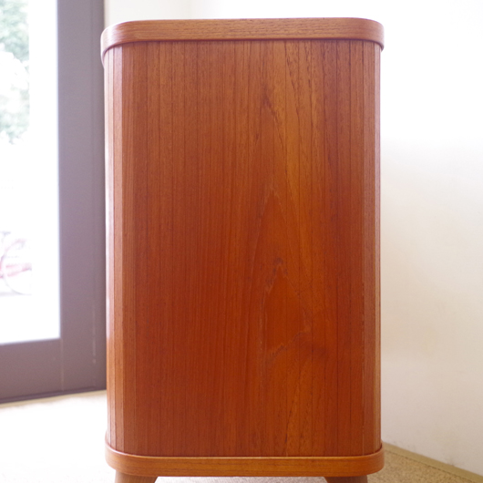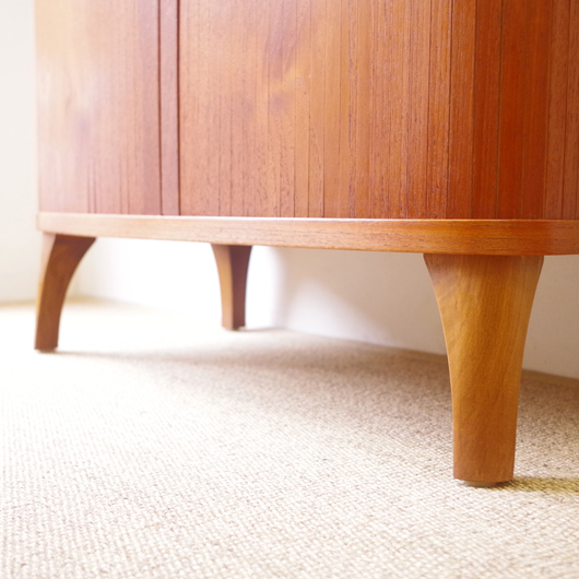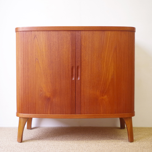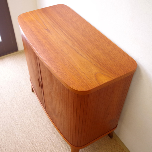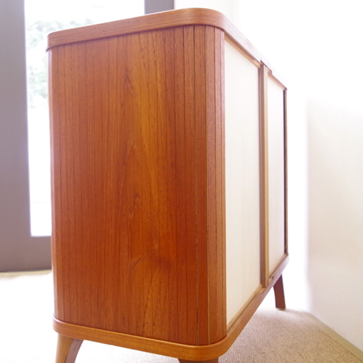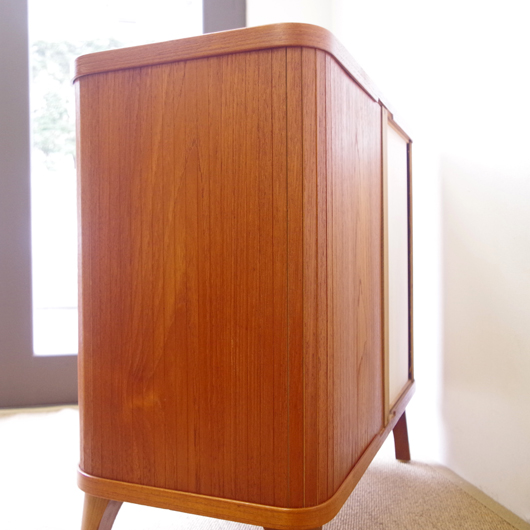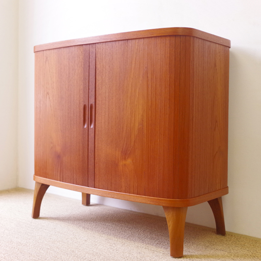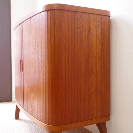 1960年代デンマーク製のヴィンテージ ロールフロント(蛇腹式)キャビネットです。チーク材の美しい木目の扉をよく見ると細かなスリットが入っており、取っ手をひくとクルクルと裏面へと回り込むロールフロント式の扉の構造となっております。また同じ蛇腹式の扉でも凹凸のあるタイプはほっこりと柔らかな雰囲気で、このスリット式のタイプはすっきりと上品にまとまっています。 一番の特徴は、扉を閉じた状態でも蛇腹が正面だけではなく側面までを覆っていることです。どこから見ても途切れることのない蛇腹扉は、高い技術に基づき、非常に洗練された印象を与えてくれます。またエッフェル塔の土台を連想させるようなデザイン性のある脚部も、見どころの一つかと思います。 内部は職人が現代の暮らしに合うように、新たに手を加えました。内壁を造り、棚板の位置を調整できるような可動式にし、確りと厚みのある棚板も合わせて2枚製作しました。リビングやダイニングなど、置く場所を問わず他のインテリアとも馴染むことと思います。 丁寧な修復を行いまして、全体的に非常にきれいな状態です。一部にわずかな小キズなどございますが、気にならない程度のものかと思います。詳しくは画像にてご確認ください。