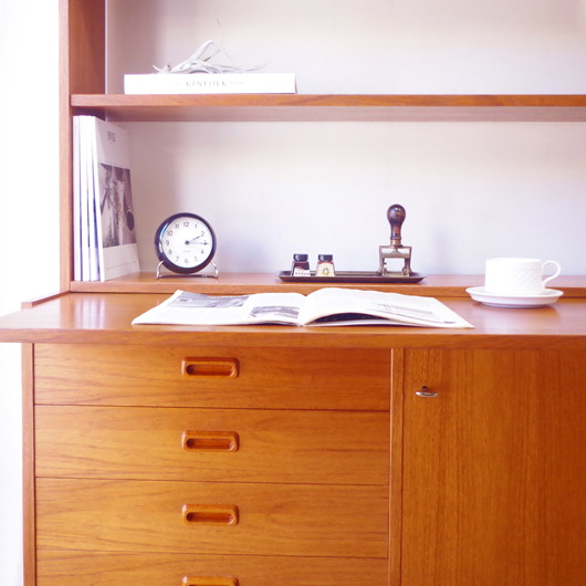 1960年代スウェーデン製の、ヴィンテージオープンシェルフです。大容量の収納力を備えながら、上段のセットバックしたデザインと背板が抜けていることで、圧迫感を感じさせない非常に軽やかな印象に仕上げられています。特徴は引き出し式の広い天板が内蔵されている点で、サッと引き出して便利にお使いいただけます。 上部2枚の棚板はいずれも可動式のため、効率良く物を置くことができます。下部左側は4段の引き出し、右側鍵付き扉内には可動式の棚板が1枚付属しています。 ダイニングに置いてカトラリーや食器などをひとまとめに、たっぷりと収納していただけます。また上部の背面が抜けているので、電子レンジなど電化製品を置いた際の配線処理もスムーズです。またリビングに置いて書籍や文具を収納したりパソコンで調べものをしたりと、それぞれの暮らしに寄り添った幅広い使い方が思い浮かびます。 丁寧な修復を行いまして、全体として綺麗な状態です。引き出しの底板も交換しておりますので、清潔にお使いいただけます。小キズがわずかにございますが、雰囲気を損ねない程度かと思います。詳しくは画像にてご確認ください。