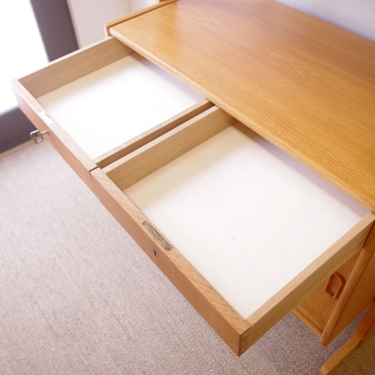1960年代スウェーデン製の、ヴィンテージオープンシェルフです。上部は棚板が4枚、下部にキャビネットが付いた作りで、背とサイドが抜けたデザインのために、高さの割に圧迫感のない軽やかな印象です。飴色へと経年変化したオーク材は空間を明るく彩り、チークなど他の木材とも合わせやすい色味です。4枚の棚板はいずれも可動式で、特徴ある金具はデザインの一部としても楽しませてくれます。 中心に支柱のあるシンメトリーな構造で、下側のキャビネット部分の背面にも化粧が施されているため、部屋の間仕切りとしてもお使いいただけます。飾り棚や本棚など、使い方が限定されない自由度の高い収納家具です。また背板が抜けていることで、小さなオーディオ機器など電化製品を置いた際の配線処理もスムーズです。 支柱や右の引出し正面などに小キズや経年感があるため、それらを考慮したお値段となっています。全体としては良好な状態で、雰囲気を損なう程ではないかと思います。詳しくは画像にてご確認ください。