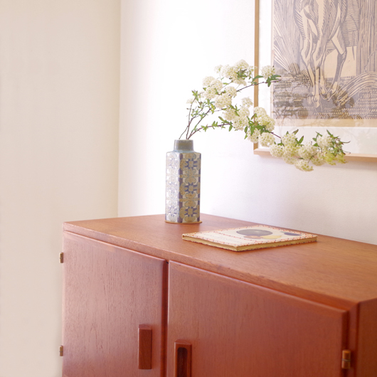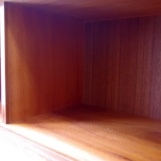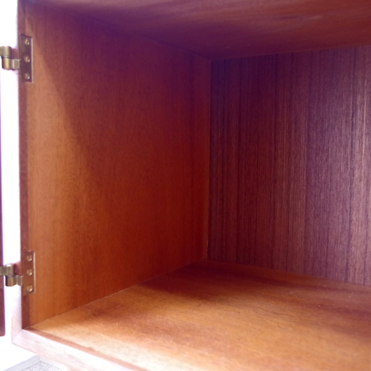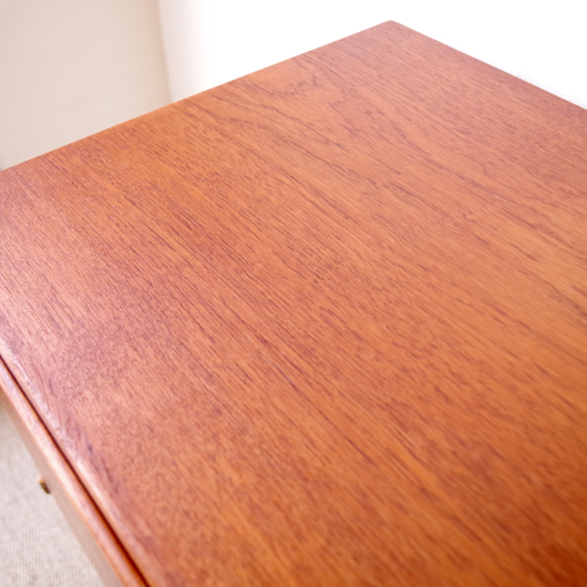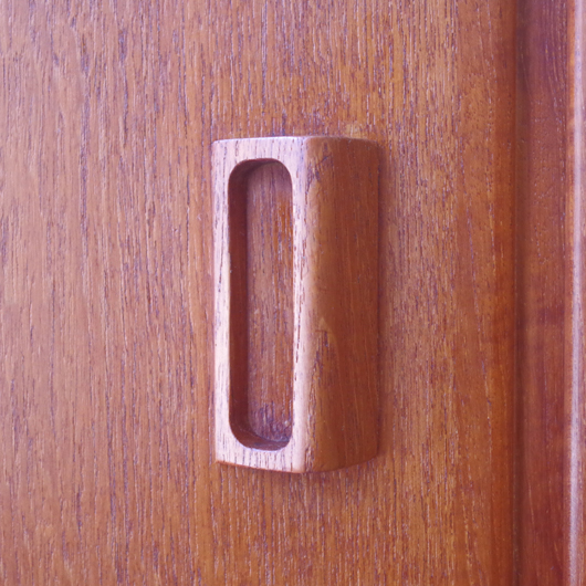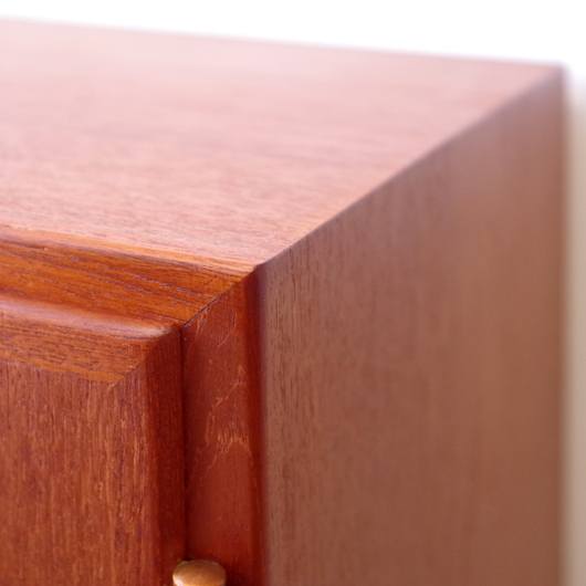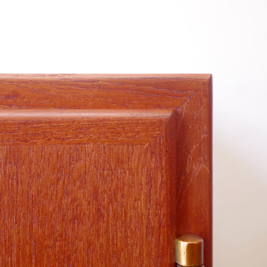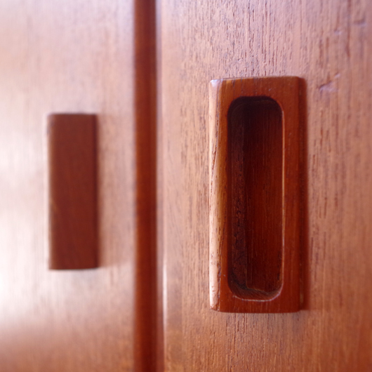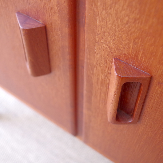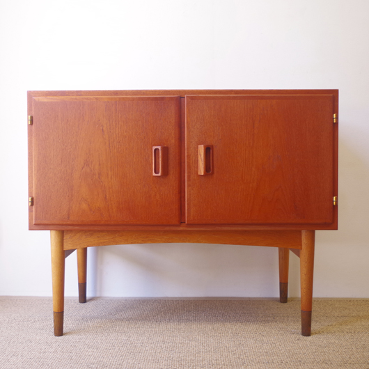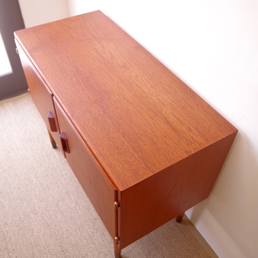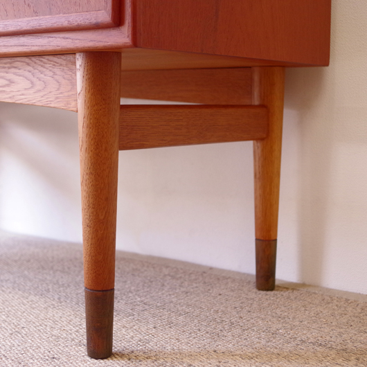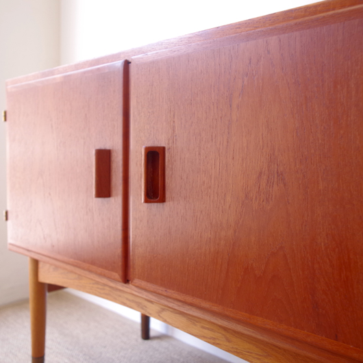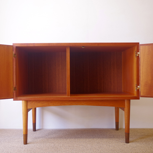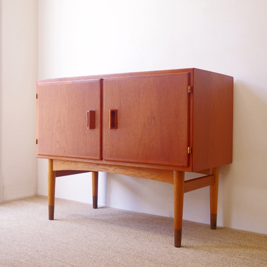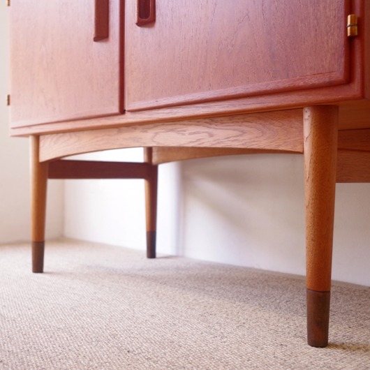 デンマークを代表する家具デザイナーの一人ボーエ・モーエンセンがデザインしました、Soborg Mobler社製のローキャビネットです。無垢材の削り出しによる取っ手の形状や、脚先に濃い色味を用いるなど、随所にモーエンセンらしさを感じます。エッジの処理など細部にまで手の込んだPeter Hvidtの家具も製造していたSoborg Moblerならではの、贅沢で確りとした作りを感じていただけます。 縦に間仕切り板が入っているので、天板の上に薄型テレビを置いてテレビ台としてもお使いいただけるかと思います。また、置く場所を限定しない程よいサイズ感もポイントの一つで、リビングに置いて絵画やポスターと組み合せたり、様々な使い方が思い浮かびます。 丁寧な修復を行い、非常に綺麗な状態です。一部に僅かな小キズなどございますが、気にならない程度かと思います。詳しくは画像にてご確認ください。