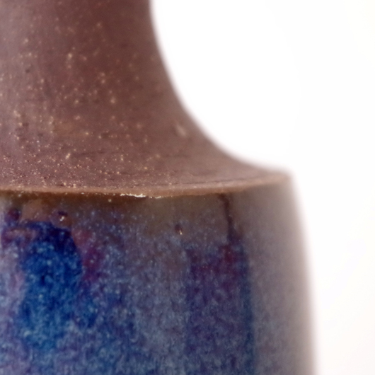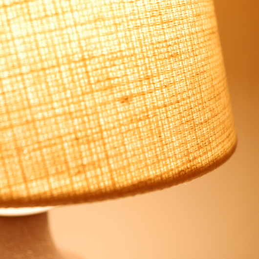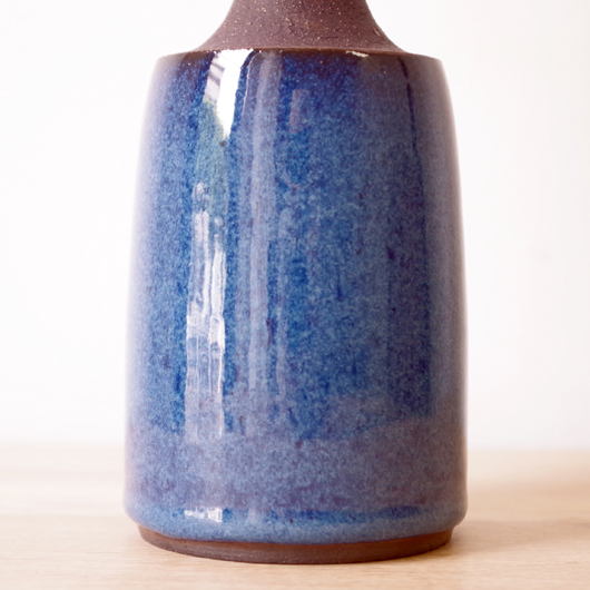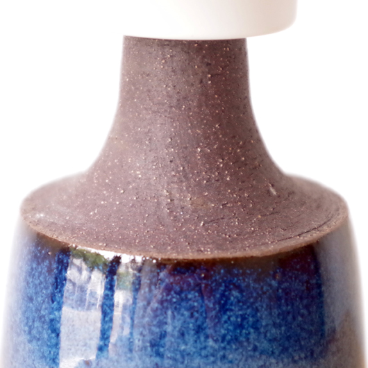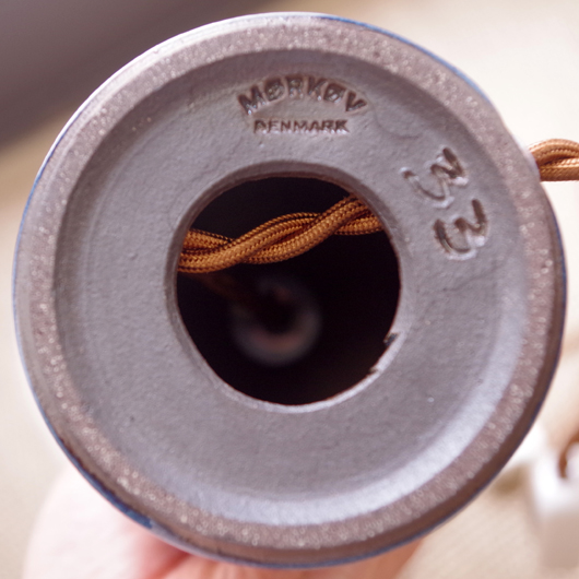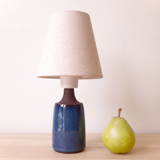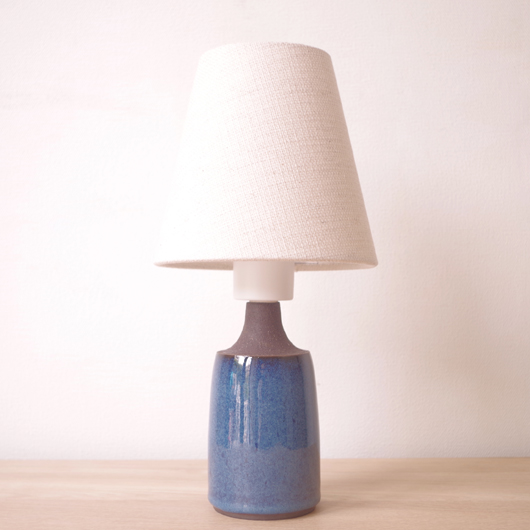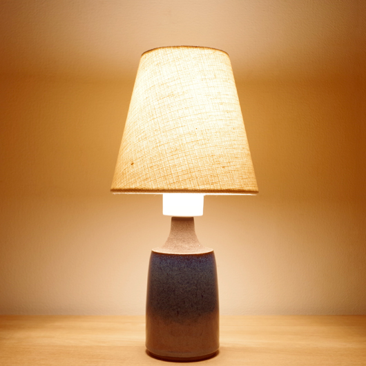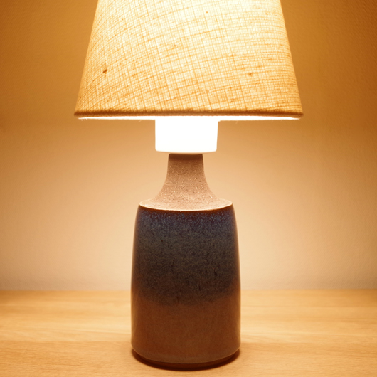 1960年代デンマークMorkov Keramikfabrik製のテーブルランプです。藍色の深みのある釉薬の色合いで、小ぶりながら存在感のある一灯です。シーリングライトなど天井からの照明のみをお使いの方にも、気軽に取り入れることのできる大きさかと思います。チェストやサイドテーブルに置いて、空間のアクセントとして活躍してくれることでしょう。 シェードは本体の形が美しく見えるように国内にてオーダーしたもので、コットン地のやわらかな織りの風合いが明かりを灯すとまた違った表情を作り出してくれます。新しく交換したコードなども、ヴィンテージに合うデザインをセレクトました。 電気工事士の資格を持つ職人によりソケット・コード・プラグ等の電気に関わる部分は全て交換しまして、電気用品安全法に基づいた点検なども行いPSEマークを表示しておりますので、新しいもの同様に安心してご使用いただけます(詳しくは下記をご覧ください)。