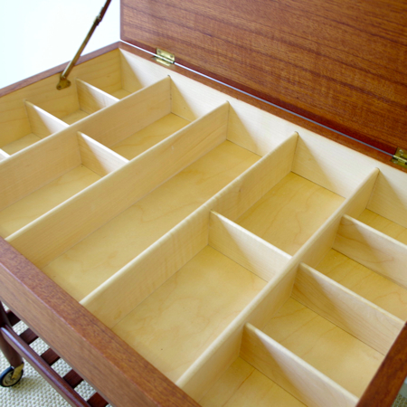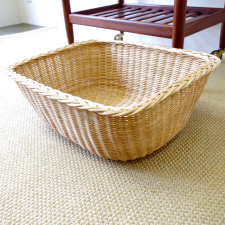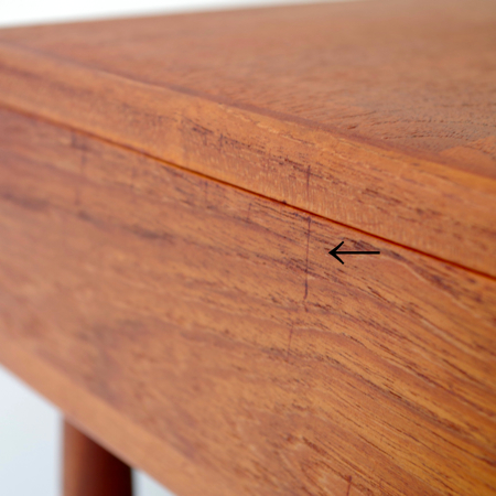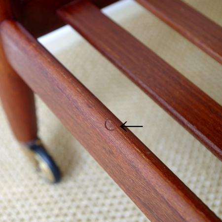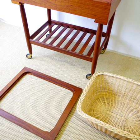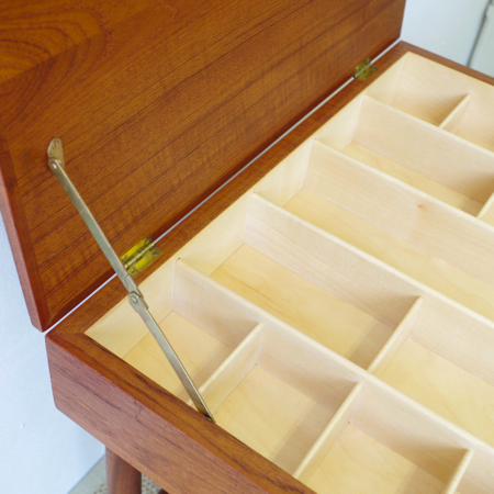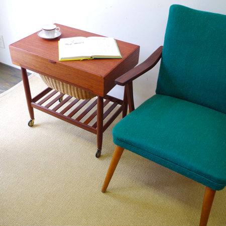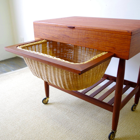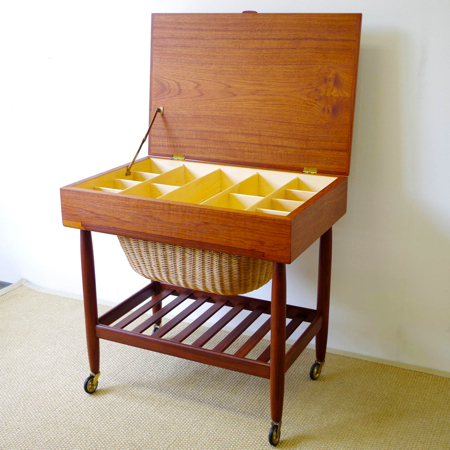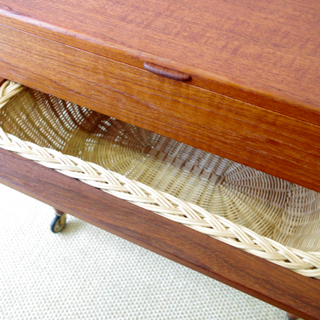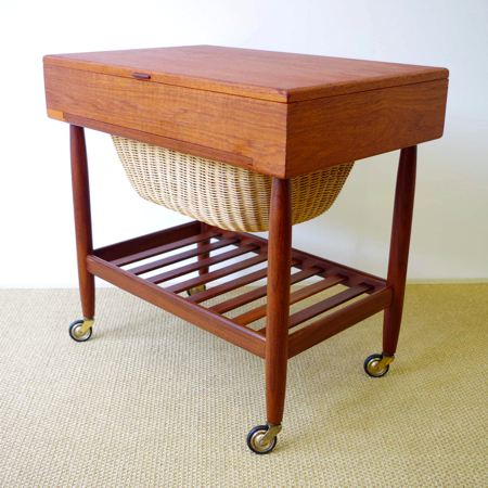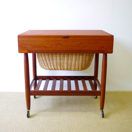 Ejvind A. Johanssonがデザインしました、1960年代デンマークFDB Mobler社製キャスター付ソーイングテーブルです。 天板を上に引き上げると、小物を整頓できる仕切りの付いた収納が現れます。夜の長い北欧諸国では裁縫が盛んだったため、裁縫道具をひとまとめに収納できるこのような家具が作られたのではないでしょうか。 その下にはスライド式の籐カゴが付いており、収納はもちろん、空間を柔らかな雰囲気に包んでくれます。そして下段には、本などを置くための棚がついており、小ぶりながらにこまごまとしたものを一息に収納できるようになっております。 またソーイングにこだわらず文具など細かいものを収納したり、ソファの横に置いてサイドテーブルとしても便利にお使いいただけます。 丁寧なメンテナンスを施しており、全体として綺麗な状態です。詳しくは画像にてご確認ください。