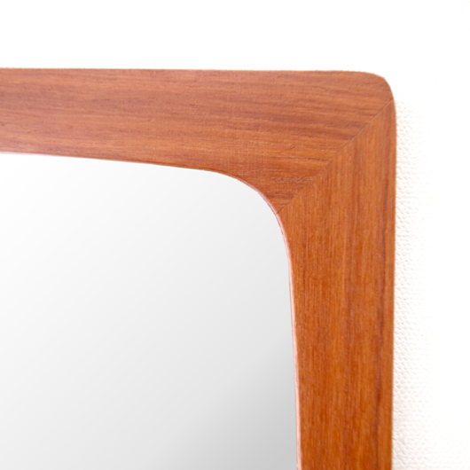 1960年代デンマーク製の、ヴィンテージ壁掛ミラー。チークの無垢材を使用したフレームは、厚みを抑えたフラットな形状で、直線的なラインの中で四隅のみ丸みをもたせたデザインが特徴となっています。 チェストと合わせてコーディネートしたり、玄関に掛けて身だしなみを整えたりと、日々の暮らしにに寄り添ってくれる一品です。また程よいサイズ感で、サニタリールームの洗面台の上に合わせても素敵です。 丁寧な修復を行いまして、全体として良好な状態です。鏡面に経年感があるため、それを考慮したお値段となっております。ご希望により別途料金にて鏡面の交換を承ります(ご希望の方はお見積もり致しますので、事前にお問い合わせください)。詳しくは画像にてご確認ください。